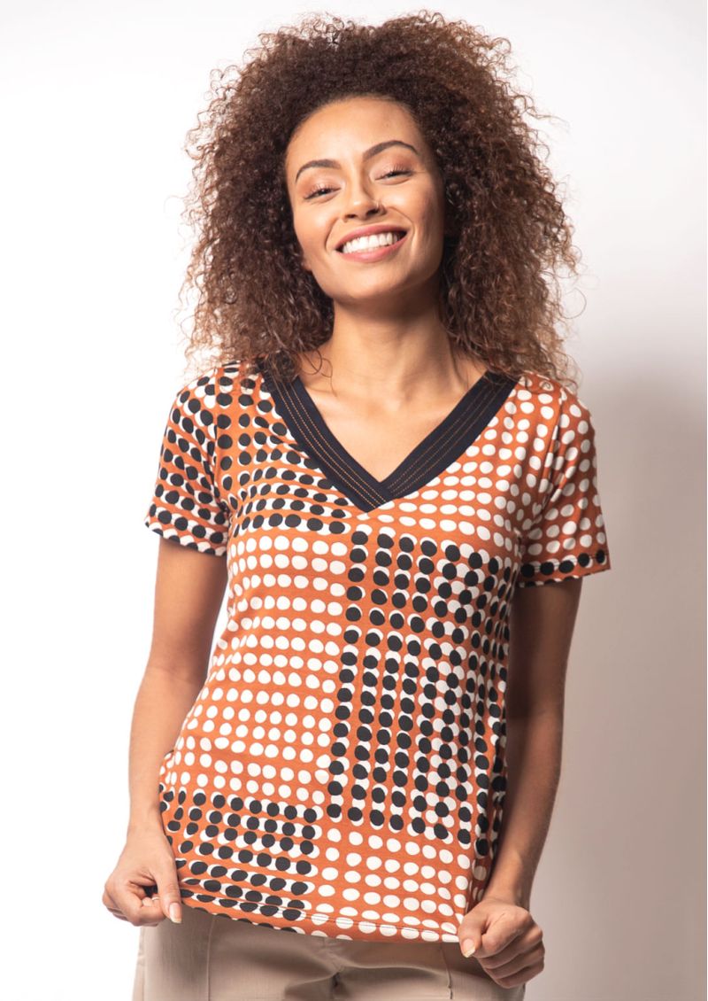 Blusa em malha estampada em tons de Telha, Preto e Off White. Mangas curtas e decote em "V", na cor Preto. Modelagem da blusa, soltinha ao corpo. Elegante e confortável. Permita-se! Composição da malha: Confeccionado em 96% Viscose e 4% Elastano. Construída em "Viscolycra" com toque macio. Medidas Aproximadas: PP: 62 x 86 x 86 x 94 cm (Comprimento, Busto, Cintura e Quadril). P: 64 x 92 x 92 x 100 cm (Comprimento, Busto, Cintura e Quadril). M: 66 x 98 x 98 x 106 cm (Comprimento, Busto, Cintura e Quadril). G: 68 x 104 x 104 x 112 cm (Comprimento, Busto, Cintura e Quadril). GG: 70 x 110 x 110 x 118 cm (Comprimento, Busto, Cintura e Quadril). XL: 72 x 116 x 116 x 124 cm (Comprimento, Busto, Cintura e Quadril). Todos os dados informados são aproximados, do peso às medidas. ATENÇÃO PARA AS MEDIDAS, POIS NOSSA MODELAGEM É AMPLA.