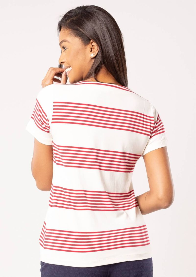 Blusa com mangas curtas e decote redondo, com acabamento em retilínea. Listrada de Vermelho, sobre o fundo Off White. Modelo com caimento perfeito, valoriza ainda mais o seu corpo. Opção versátil e elegante. Aproveite!!! Composição da malha: Confeccionado em Viscolycra 95% Viscose e 5% Elastano. Medidas Aproximadas: P: 60cm Comprimento x 90cm Busto x 90cm Cintura x 104cm Quadril. M: 62cm Comprimento x 96cm Busto x 96cm Cintura x 110cm Quadril. G: 64cm Comprimento x 102cm Busto x 102cm Cintura x 116cm Quadril. GG: 66cm Comprimento x 108cm Busto x 108cm Cintura x 122cm Quadril. XL: 68cm Comprimento x 114cm Busto x 114cm Cintura x 128cm Quadril. Todos os dados informados são aproximados, do peso às medidas. ATENÇÃO PARA AS MEDIDAS, POIS NOSSA MODELAGEM É AMPLA! *Modelo está usando o tamanho P*