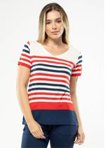 Blusa Listrada em Azul Marinho, Vermelho e Off White, com decote em "V". Mangas curtas com detalhe de fivela. Confortável, fresquinha e elegante. Permita-se! Composição da malha: Confeccionado em 95% Viscose e 5% Elastano. Medidas Aproximadas: P: 64cm Comprimento x 90cm Busto x 92cm Cintura x 102cm Quadril. M: 66cm Comprimento x 96cm Busto x 98cm Cintura x 108cm Quadril. G: 68cm Comprimento x 102cm Busto x 104cm Cintura x 114cm Quadril. GG: 70cm Comprimento x 108cm Busto x 110cm Cintura x 120cm Quadril. XL: 72cm Comprimento x 114cm Busto x 116cm Cintura x 126cm Quadril. Todos os dados informados são aproximados, do peso às medidas. ATENÇÃO PARA AS MEDIDAS. MODELAGEM AMPLA. *Modelo está usando o tamanho P*