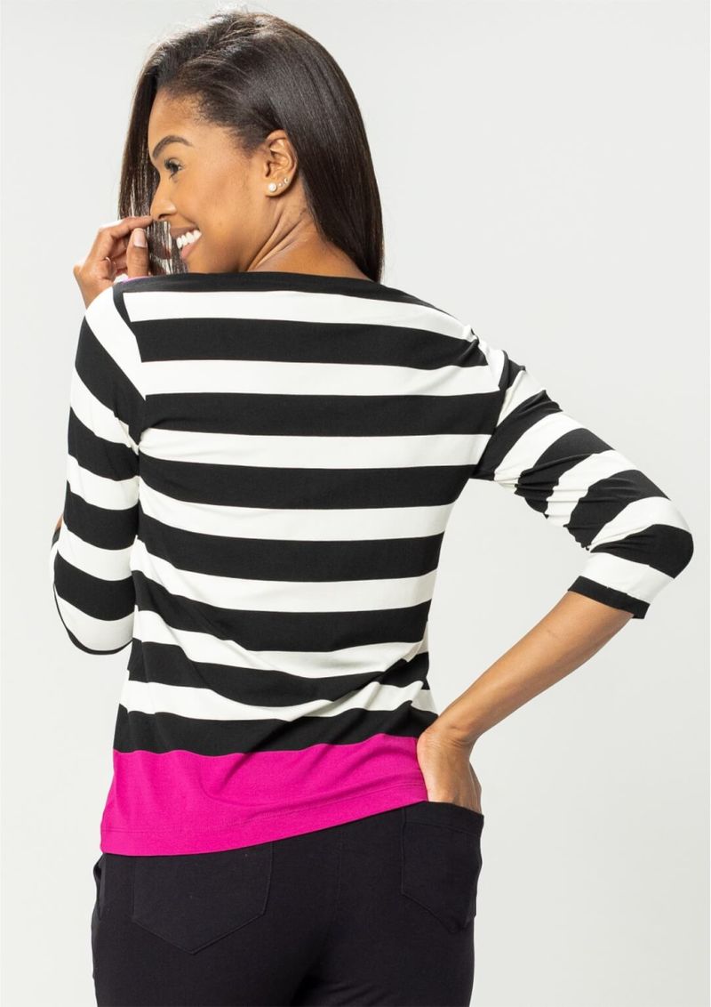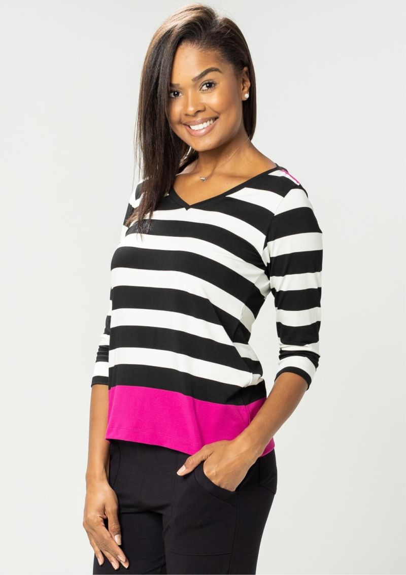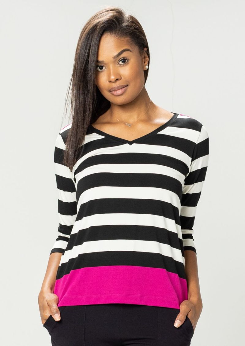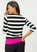 Blusa decote em "V" e mangas 3/4. Listrada nas cores Preto e Off White. Possui detalhe de vivo no ombro e barras na cor Roxo. Ter uma blusa Pau a Pique listrada em seu guarda roupa é a certeza de que se tem um modelo incrível, confortável e de extrema qualidade. Confira!!! Composição da malha: Confeccionado em 95% Viscose e 5% Elastano. Medidas Aproximadas: P: 61cm Comprimento x 92cm Busto x 92cm Cintura x 100cm Quadril. M: 63cm Comprimento x 98cm Busto x 98cm Cintura x 106cm Quadril. G: 65cm Comprimento x 104cm Busto x 104cm Cintura x 112cm Quadril. GG: 67cm Comprimento x 110cm Busto x 110cm Cintura x 118cm Quadril. XL: 69cm Comprimento x 116cm Busto x 116cm Cintura x 124cm Quadril. Todos os dados informados são aproximados, do peso às medidas. ATENÇÃO: para as medidas modelagem ampla. *Modelo está usando o tamanho P*