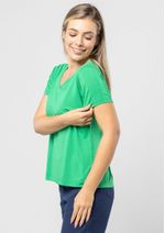 Blusa básica na cor Verde. Decote em "V" e mangas curtas com detalhe de nervuras. Modelo prático, versátil e descomplicado para o dia a dia. Aproveite!!! Composição da malha: Viscolycra 96% Viscose e 4% Elastano. Medidas Aproximadas: P: 60cm Comprimento x 90cm Busto x 94cm Cintura x 102cm Quadril. M: 62cm Comprimento x 96cm Busto x 100cm Cintura x 108cm Quadril. G: 64cm Comprimento x 102cm Busto x 106cm Cintura x 114cm Quadril. GG: 66cm Comprimento x 108cm Busto x 112cm Cintura x 120cm Quadril. XL: 68cm Comprimento x 114cm Busto x 118cm Cintura x 126cm Quadril. Todos os dados informados são aproximados, do peso às medidas. ATENÇÃO PARA AS MEDIDAS, POIS NOSSA MODELAGEM É AMPLA! *Modelo está usando o tamanho P*