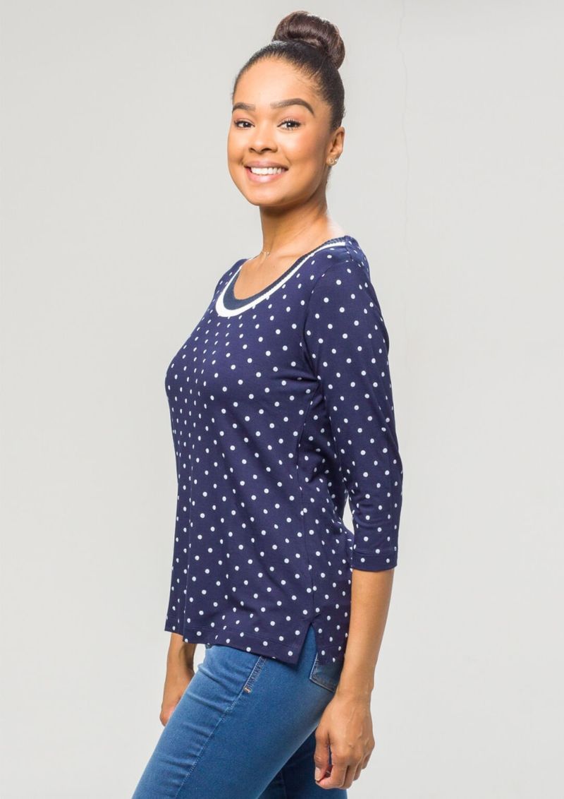 Blusa com decote redondo e mangas 3/4. Estampa em Poá sobre o fundo Azul Marinho. Possui acabamento em retilínea no decote. A estampa em Poá é um clássico atemporal. Moderna e confortável. Arrase! Composição da malha: Confeccionada em 96% Viscose e 4% Elastano. Toque macio. Medidas Aproximadas: P: 63cm Comprimento x 92cm Busto x 90cm Cintura x 100cm Quadril. M: 65cm Comprimento x 98cm Busto x 96cm Cintura x 106cm Quadril. G: 67cm Comprimento x 104cm Busto x 102cm Cintura x 112cm Quadril. GG: 69cm Comprimento x 110cm Busto x 108cm Cintura x 118cm Quadril. XL: 71cm Comprimento x 116cm Busto x 114cm Cintura x 124cm Quadril. Todos os dados informados são aproximados, do peso às medidas. ATENÇÃO PARA AS MEDIDAS. MODELAGEM AMPLA.