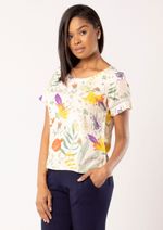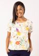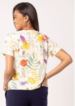 Blusa com decote redondo e mangas curtas, compostas por detalhe de entremeio. Malha estampada, sobre o fundo Off White. Modelagem soltinha ao corpo. Barra com pequenas fendas laterais. Moderna, confortável e fresquinha. Arrase! Composição da malha: Confeccionado em 100% Viscose. Toque macio. Sem Elasticidade. Medidas Aproximadas: P: 59cm Comprimento x 106cm Busto x 102cm Cintura x 114cm Quadril. M: 61cm Comprimento x 112cm Busto x 108cm Cintura x 120cm Quadril. G: 63cm Comprimento x 118cm Busto x 114cm Cintura x 126cm Quadril. GG: 65cm Comprimento x 124cm Busto x 120cm Cintura x 132cm Quadril. Todos os dados informados são aproximados, do peso às medidas. ATENÇÃO PARA AS MEDIDAS, POIS NOSSA MODELAGEM É AMPLA! *Modelo está usando o tamanho P*