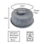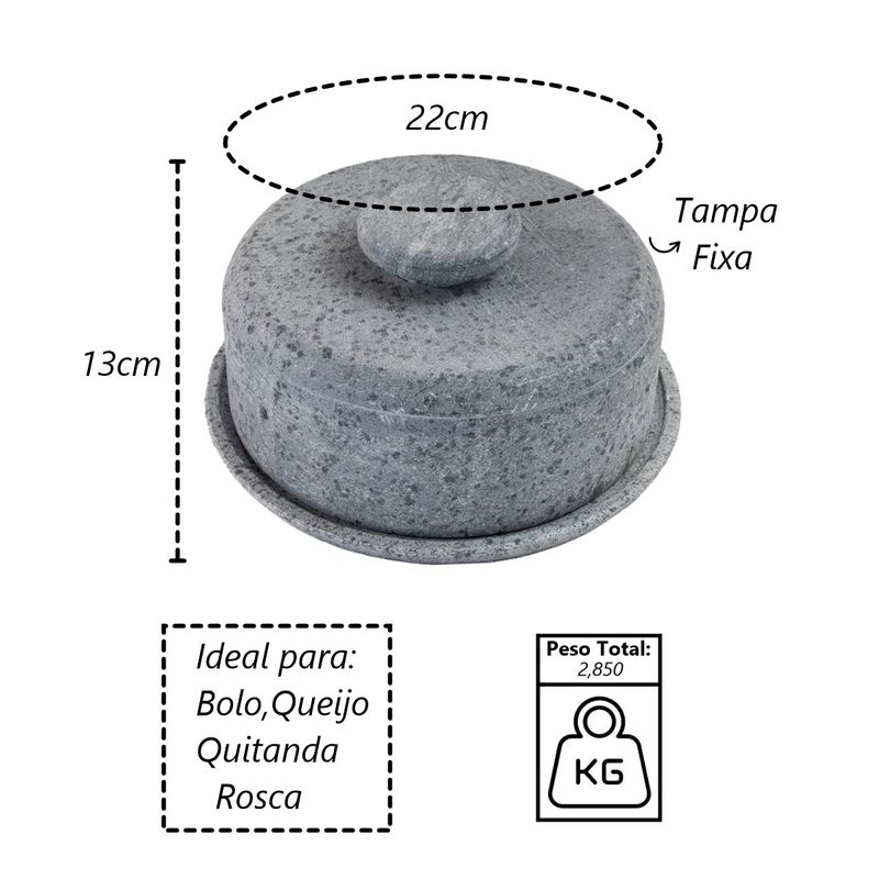 Boleira e Queijeira Gourmet Tampa de Pedra Sabão G 13x22cm A boleira queijeira de pedra de sabão é um utensílio utilizado principalmente para servir bolos, queijos e outros alimentos de forma elegante e prática. A pedra de sabão, material do qual é feita, possui algumas características especiais que a tornam ideal para essa finalidade. Manutenção da Temperatura: Mantém alimentos frescos ou quentes por mais tempo. Estética: Oferece uma apresentação rústica e elegante. Durabilidade: É resistente e duradoura. Higiene: Facilita a limpeza devido à sua superfície antiaderente. Características Técnicas:Diâmetro: 22cm.Peso: 2,850Kg.Altura: 13cm. Itens Inclusos:01 Boleira e Queijeira Gourmet Tampa de Pedra Sabão G 13x22cm. Código: AF1012INDSJ ProdutoLojaPlast.