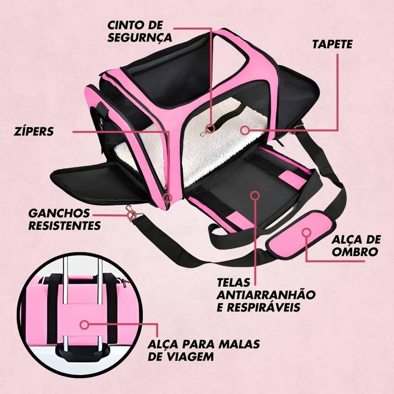 Bolsa de Viagem para Transporte Pet Alças Ajustáveis ===================================== Contém: 01 Unidade Especificações: - Material de Alta Qualidade - Medida: 35cm x 23cm x 33,8cm - Confortável e Durável - Resistente ao Desgaste e Fácil de Limpar - Ventilação Otimizada - Segurança Reforçada - Conforto Ergonômico - Alças Ajustáveis Ergonomicamente - Versatilidade e Estilo - Cor: Rosa ===================================== Devido à diferença entre monitores e iluminação diferentes, pode haver variação na tonalidade apresentada no anúncio. Medidas muito aproximadas.
