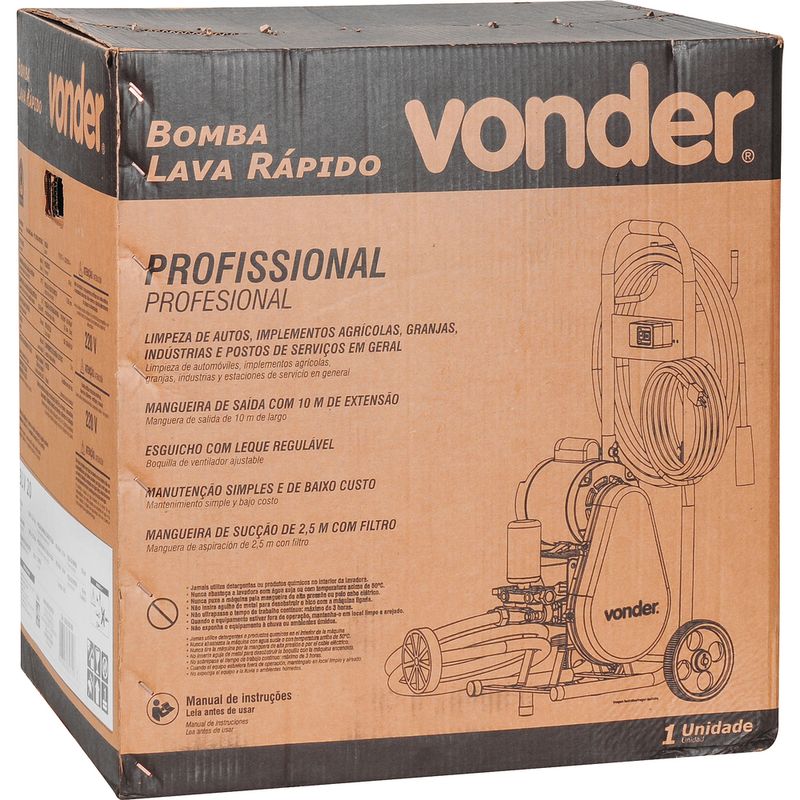Ref. Fornecedor: 6864020000Marca: VonderConteúdo Embalagem:1 Bomba lava-rápido, acompanha: esguicho ajustável, mangueira de saída de 10 metros e mangueira de sucção de 2,5 m com filtroDestaques e diferenciais:Possui válvulas em aço inox, chave elétrica de 30 A, protetor de correia de acordo com a norma NR-12, mangueira com 10 metros de extensão, esguicho com leque regulável e manutenção simples e de baixo custoAplicações e dicas de uso:Indicada para limpezas de autos, implementos agrícolas, granjas, indústrias e postos de serviços em geralCaracterísticas Técnicas:Linha: Profissional Potência da lavadora de alta pressão: 1.500 W / 2,0 cv Pressão nominal de saída de água da lavadora de alta pressão: 450 lbf/pol² - 31 bar Vazão máxima da lavadora de alta pressão: N/A Comprimento da mangueira de alta pressão da lavadora: 10,0 m Tensão (V): 110-127 V / 220-254 VGarantia legal: 90 dias + Garantia contratual: 3 meses