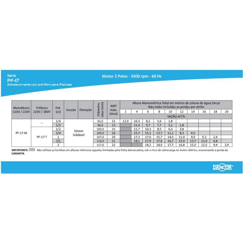 Bomba para Piscina Autoescorvante 1/3 CV Monofásica PF-17 DANCORA Bomba para Piscina Autoescorvante 1/3 CV Monofásica PF-17 DANCOR é um equipamento eficiente e robusto, ideal para aplicações residenciais e prediais. Projetada para oferecer alto desempenho no bombeamento de água em piscinas, essa bomba autoescorvante garante um funcionamento confiável e seguro, evitando problemas como falta de pressão ou falhas na sucção, com um motor elétrico desenvolvido de acordo com a norma Nema MG1-18.326 a MG1-18.341 – “Jet Pump”, essa bomba opera com 2 polos e rotação de 3.500 rpm em frequência de 60 Hz. Sua potência de 1/3 CV proporciona um funcionamento estável, com baixo consumo de energia e alta eficiência na circulação da água. Além disso, conta com grau de proteção IP 21, que protege contra partículas sólidas e respingos d’água, garantindo maior durabilidade do equipamento.Para maior segurança e resistência térmica, a bomba possui isolamento Classe F, conferindo maior proteção contra superaquecimento e ampliando sua vida útil. Quanto às tensões disponíveis, a versão monofásica opera em 110-127/220-254V, enquanto a versão trifásica permite conexão em 220/380V, proporcionando versatilidade na instalação de acordo com a necessidade do usuário, graças ao seu sistema autoescorvante, essa bomba é capaz de eliminar o ar presente na tubulação de sucção, garantindo um funcionamento eficiente mesmo em situações onde há dificuldade na circulação da água. Esse recurso facilita a manutenção e melhora a performance do equipamento, sendo uma excelente escolha para quem busca confiabilidade e praticidade no cuidado com piscinas.VANTAGENS E BENEFÍCIOS Sistema Autoescorvante: Elimina automaticamente o ar da tubulação, garantindo um funcionamento contínuo e eficiente, mesmo em situações com dificuldade de sucção.Motor de Alto Desempenho: Desenvolvido conforme norma Nema MG1, opera com 2 polos e rotação de 3.500 rpm, proporcionando eficiência no bombeamento com baixo consumo de energia.Maior Segurança e Durabilidade: Conta com isolamento Classe F, que protege contra superaquecimento, além de grau de proteção IP 21, oferecendo resistência a partículas sólidas e respingos d’água.Versatilidade na Instalação: Disponível em versões monofásica (110-127/220-254V) e trifásica (220/380V), permitindo adaptação às necessidades elétricas do usuário.Construção Robusta e Confiável: Projetada para aplicações residenciais e prediais, garantindo circulação eficiente da água em piscinas com máxima segurança e desempenho.DADOS TÉCNICOSNorma: Nema MG1-18.326 a MG1 – 18.341 – “Jet Pump”2 polos: 3.500 rpm – 60 HzGrau de Proteção: IP 21Isolamento: Classe FMaterial Carcaça: ABS reforçado com fibra de vidro e termoplásticoRotor: do tipo fechado, injetado em Noryl reforçado com fibra de vidro com ressalto na parte posterior e roscado diretamente na ponta do eixo.Vedação do eixo: por selo mecânico – Ø 3/4”, tipo “16”, construído com borracha nitrílica, mola de aço inox e as faces de vedação em grafite e cerâmica.Medidas (AxLxC)(cm): 29,5 x 20,2 x 55,5Peso (Kg): 9,1Garantia:3 mesesReferência: 10445978Marca: DANCOR* Imagens meramente ilustrativas.