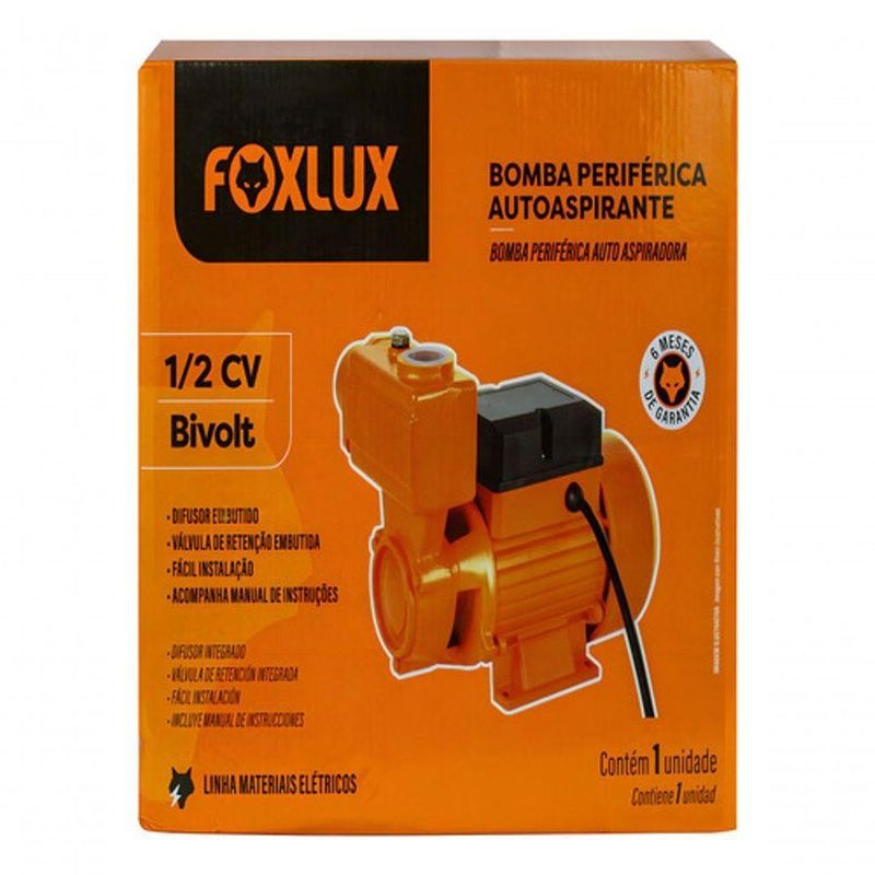 Bomba Periférica Autoaspirante 1/2 Cv 220v FoxluxBomba Periférica Autoaspirante 1/2 cv 220 Foxlux Foi projetada para oferecer um desempenho contínuo e sem interrupções. Podendo ser utilizado em residências, jardins e irrigações. O motor de1cv oferece uma boa combinação de potência e economia. Seu modelo é bivolt que da uma flexibilidade para diferentes instalações elétricas. A bomba autoaspirante permite que ela continue funcionando mesmo em situações onde há ar misturado á água. Com um inovador difusor de ar, esta bomba elinima o ar na tubulação, garantindo um funcionamento permanente e eficiente. Possui válvula de retenção mas não acompanha fluxostato. Diferenciais - Válvula de retenção embutida. - Trabalha com água limpa. - Design compacto e silencioso. - Possui termostato que desliga a bomba automaticamente em caso de superaquecimento, evitando queima do motor, - Difusor embutido Ficha Técnica - Potência do motor: 1/2 cv - Voltagem:220 - Altura manométrica: 37 mca - Vazão máxima: - Sucção máxima :8mca - Garantia: 6 meses Sobre a marca A Foxlux é referência no mercado brasileiro de materiais elétricos e soluções para iluminação. Com uma trajetória de inovação e qualidade, a marca é conhecida por desenvolver produtos que combinam tecnologia e durabilidade. A Foxlux oferece uma ampla de itens que atendem desde o uso residencial até o industrial, sempre com o compromisso de proporcionar eficiência e aos seus clientes.