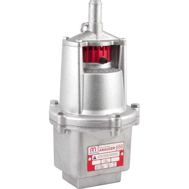 Bomba Submersa 650 5G, 220 V~, 60560, Anauger - Conteúdo da embalagem: 1 Bomba submersa, acompanha: 3 abraçadeiras e 1 curva suporte. Aplicação: Indicada para poços com diâmetro igual ou superior a 180 mm, no abastecimento doméstico, pequenas irrigações e criação de animais. Utilizada somente para bombeamento de água limpa. Temperatura máxima da água: 35°C. Profundidade máxima de utilização abaixo do nÃvel da água: 1 m. Exemplos de elevação x vazão: 0 m - 1.600 litros/hora, 10 m - 1.350 litros/hora, 20 m - 1.110 litros/hora, 30 m - 900 litros/hora, 40 m - 750 litros/hora, 50 m - 600 litros/hora, 60 m - 500 litros/hora. Destaques: 5ª geração, novo design, nova tecnologia e performance superior. Excelente rendimento, com vazões ideais para bombeamento de água em residências. Fácil instalação. Referência: 60560 Garantia - E (CDC): Garantia legal: 90 dias + Garantia contratual: 21 meses Tensão (V): 220 V~ Vazão máxima da bomba: 1.600 litros/hora Altura manométrica máxima da bomba: 60,0 m Medida da saÃda de água da bomba: 3/4" Cor da bomba: Cinza com detalhes em vermelho Potência da bomba submersa: 340 W Frequência: 60 Hz Classe de proteção de choque elétrico: Classe II Modelo: 650 5G Tipo de bomba: Submersa vibratória Dimensões da bomba: 290 mm x 155 mm Diâmetro interno mÃnimo do poço: 7" - 180 mm Submersão máxima: 20 m Temperatura máxima do lÃquido: 35°C Ãndice de proteção: IP68 Segue norma(s): ABNT NBR NM IEC 60335-1:2010 | ABNT NBR 5410:2004 | ABNT NBR ISO 9001 Massa aproximada (peso): 4.9 kg Destaques Comercial: 5ª geração, novo design e tecnologia, alto rendimento e fácil instalação para bombeamento residencial. Aplicação Comercial: Para poços =180 mm no abastecimento doméstico, pequenas irrigações e criação de animais. Para água limpa até 35°C e 1 m de profundidade. Vazão: 1600 L/h (0 m) a 500 L/h (60 m). Características Gerais do Produto: Garantia: • 3 Meses