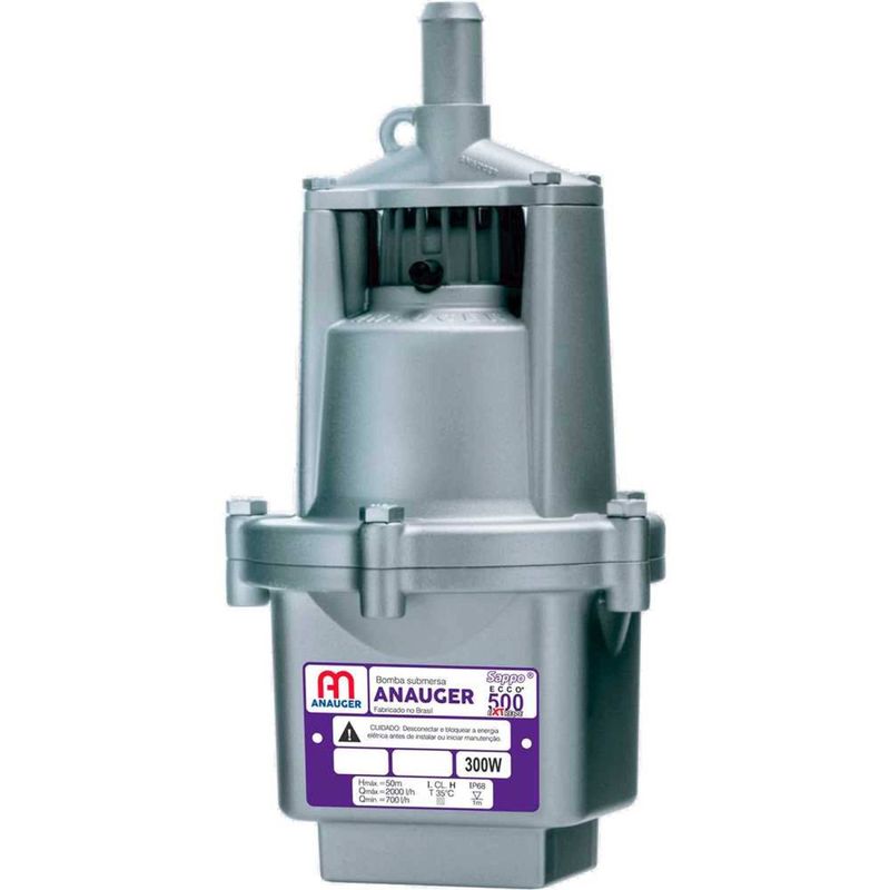 Bomba Submersa Vibratória, Saída 3/4", 300 W, Ecco 500 Extreme, 127 V~, 60514 Anauger - Conteúdo da embalagem: 1 Bomba submersa. Aplicação: Indicada para aplicações com água limpa em residenciais, industriais, agrÃcolas e comerciais. Destaques: Possui isolação elétrica na classe H. Grau de proteção IP68. Proteção contra choque elétrico classe II. Garantia - E (CDC): Garantia legal: 90 dias + Garantia contratual: 9 meses Referência: 60514 Modelo: ECCO 500 EXTREME Tipo de bomba: Submersa vibratória Potência da bomba submersa: 300 W Dimensões da bomba: 290 mm x 150 mm Diâmetro interno mÃnimo do poço: 180 mm Medida da saÃda de água da bomba: 3/4" Altura manométrica máxima da bomba: 50 m Submersão máxima: 20 m Temperatura máxima do lÃquido: 35°C Vazão máxima da bomba: 2.000 litros/hora Classe de proteção de choque elétrico: Classe II Ãndice de proteção: IP 68 Segue norma(s): ISO 9001 Cor da bomba: Prata Tensão (V): 127 V~ Frequência: 60 Hz Massa aproximada (peso): 5 kg Destaques Comercial: Possui isolação elétrica classe H, proteção IP68 e contra choque elétrico classe II. Aplicação Comercial: Indicada para aplicações com água limpa em residências, indústrias, agricultura e comércio. Características Gerais do Produto: Garantia: • 3 Meses