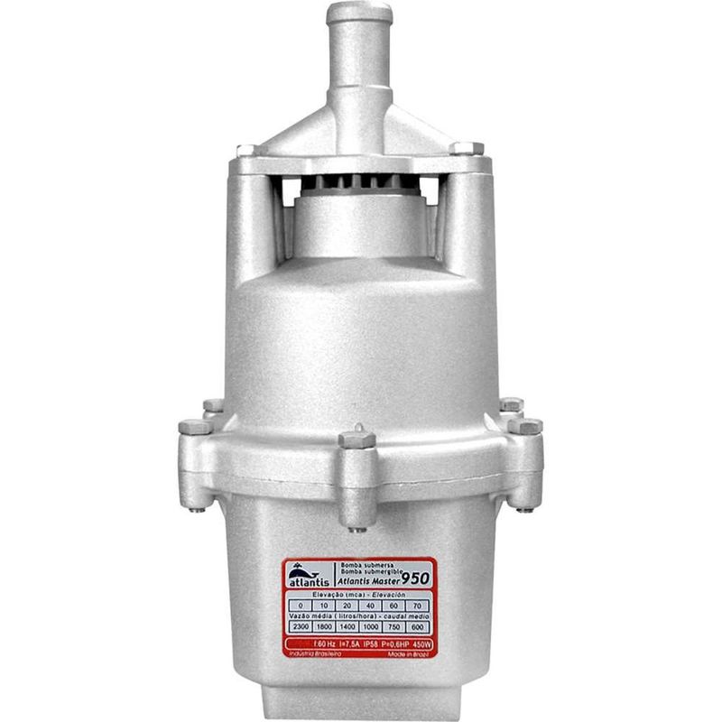 Bomba Submersa Vibratória, Saída de 1", 127 V~, 0,6 hp, Master 950, 503 Atlantis - Conteúdo da embalagem: 1 Bomba submersa. Aplicação: Indicada para aplicações residenciais, industriais, agrÃcolas e comerciais. Ideal para quem optar por velocidade e potência nas transferências de água, com vazão de até 2.300 litros/hora e uma elevação máxima de 70 metros. Destaques: Bomba submersa vibratória Master 950, com 1" de saÃda e alta vazão. A bomba vibratória Atlantis é produzida com insumos de alta qualidade dos melhores fornecedores, aumentando assim a sua durabilidade e tempo de uso. Possui circuito antiqueima, que evita o superaquecimento e impede a queima da bomba em caso de falta d´água no reservatório. Corpo em alumÃnio jateado, promove uma melhor troca de temperatura entre a bomba e a água, com parafusos em aço inoxidável, que não enferrujam e permitem a abertura para manutenção. Com etiqueta em alumÃnio anodizado, assegurando a preservação das referências técnicas do produto. As bombas Atlantis possuem qualidade assegurada do produto, pois são testadas uma a uma ao final do processo produtivo. Referência: 503 Garantia - E (CDC): Garantia legal: 90 dias + Garantia contratual: 9 meses Modelo: Master 950 Tipo de bomba: Submersa vibratória Potência da bomba submersa: 447 W - 0,6 hp Dimensões da bomba: 290 mm x 165 mm Medida da saÃda de água da bomba: 1" Cor da bomba: Prata Frequência: 60 Hz Tensão (V): 127 V~ Altura manométrica máxima da bomba: 70 m Vazão máxima da bomba: 2.300 litros/hora Massa aproximada (peso): 4,5 kg Ãndice de proteção: IP 68 Diâmetro interno mÃnimo do poço: 170 mm Submersão máxima: 20 m Temperatura máxima do lÃquido: 35°C Classe de proteção de choque elétrico: Classe l Segue norma(s): ABNT NBR NM IEC 60335-1:2010 / ABNT NBR 5410:2004 Destaques Comercial: Bomba submersa vibratória Master 950, 1" de saÃda, alta vazão e durável, com circuito antiqueima e corpo em alumÃnio jateado para melhor troca térmica e proteção. Testada individualmente para garantir qualidade. Aplicação Comercial: Uso residencial, industrial, agrÃcola e comercial. Oferece alta velocidade e potência, com vazão até 2.300 L/h e elevação máxima de 70 m. Características Gerais do Produto: Garantia: • 3 Meses