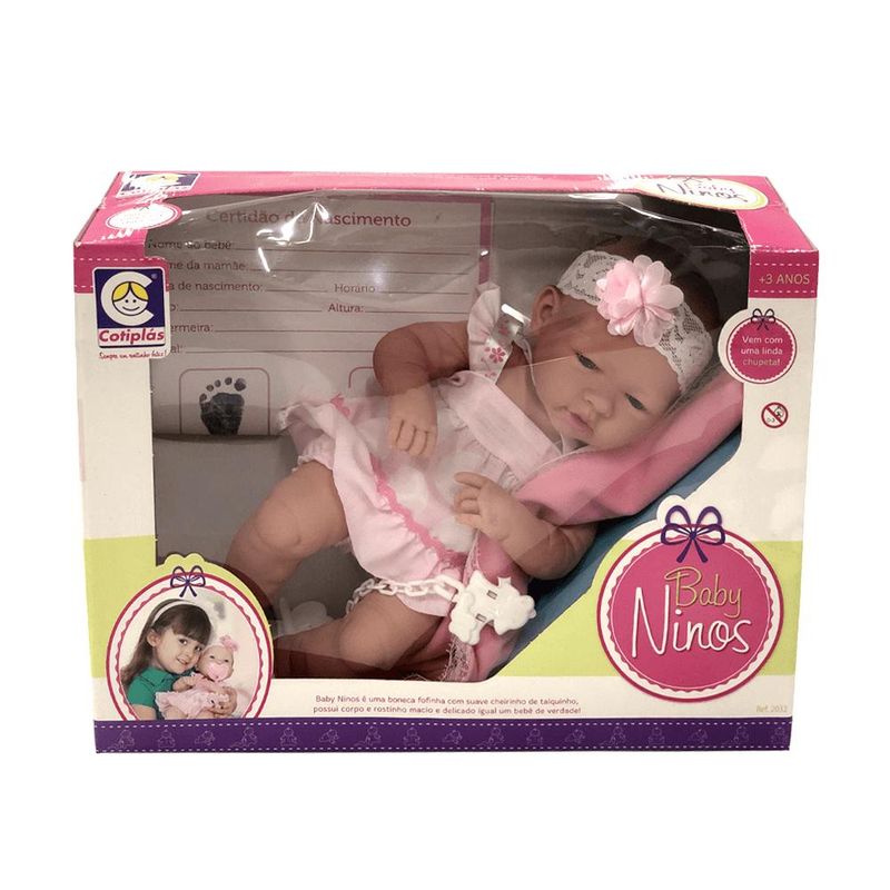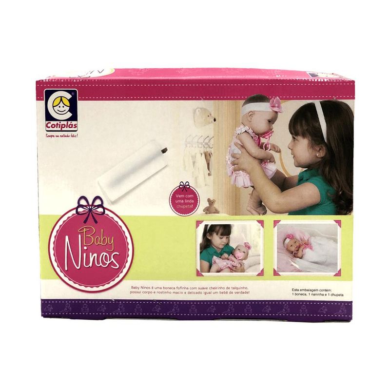 A Boneca Baby Ninos da Cotiplás é simplesmente perfeita. Tem cheirinho de bebezinho, é macio e muito gostoso de abraçar! Quando você pegar os bebezinhos ninos no colo, não vai mais querer largar! Possuem corpo e rostinho macio e delicado igual a um bebê de verdade! Características: • Marca: Cotiplás • Modelo: Baby Ninos • Altura da Boneca: 37,5 centímetros • Idade recomendada: Acima de 03 anos de idade INMETRO: CE-BRI/0228 NM 300/2002 Segurança do Brinquedo Garantia: • Garantia do Fornecedor: 03 meses contra defeitos de fabricação Itens inclusos: • 01 Boneca • 01 Naninha • 01 Chupeta Peso e Dimensões Aproximadas do produto na caixa: • Largura: 15 cm. Altura: 30 cm. Profundidade: 40 cm. • Peso: 850 g As cores podem variar entre as imagens mostradas acima e o produto. Imagens meramente ilustrativas.