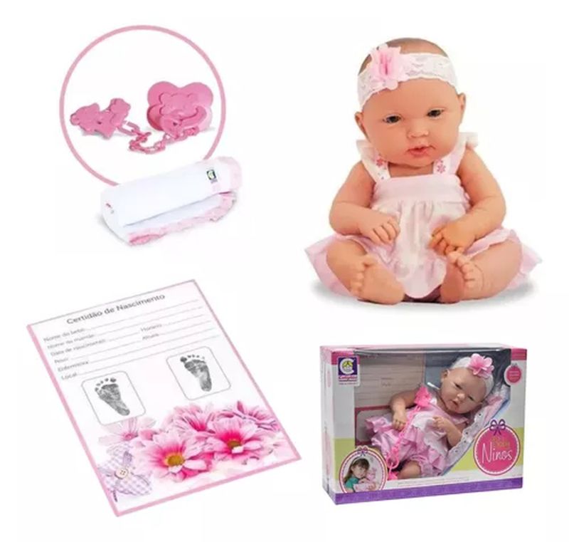 BONECA BABY NINOS - COTIPLAS A Boneca Baby Ninos da Cotiplas é uma linda boneca que contribui muito com a interatividade da criança. ela possui tamanho e expressão de um bebê de verdade, o que a torna ideal para desenvolver a imaginação da criança e sua afetividade. Ela é super fofinha com suave cheirinho de talquinho, possui corpo e rostinho macio e delicado igual de bebê de verdade. Vem com uma linda chupeta e manta para deixar a brincadeira ainda mais divertida. A Boneca Baby Ninos da Cotiplas é a companheira perfeita para as crianças que adoram cuidar de bebês! Com seus detalhes realistas, e seus acessórios encantadores, essa boneca estimula a imaginação e a criatividade das pequenas. A Boneca Boneca Baby Ninos da Cotiplas é feita toda em vinil macio e lavável! Baby Ninos é uma coleção encantadora de bonecas macias e com suave cheirinho de bebê, perfeitas para todos os momentos, pois ela proporciona horas de diversão e aprendizado. Especificações: • Contém: 1 Boneca, 1 Chupeta com prendedor, 1 Manta e 1 Certidão de Nascimento • Altura da Boneca: 37cm Aproximadamente • Coleção: Baby Ninos • Idade: +3 anos • Referência: 2032 • Marca: Cotiplás INMETRO: • Registro: 001050/2022 Aviso: IMAGENS MERAMENTE ILUSTRATIVAS! AS CORES DO LAÇO DA TIARA, MANTA E DA ROUPA DA BONECA PODEM VARIAR!