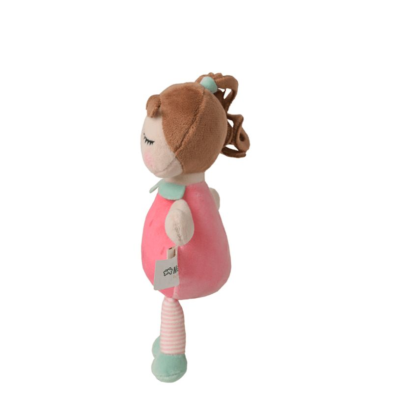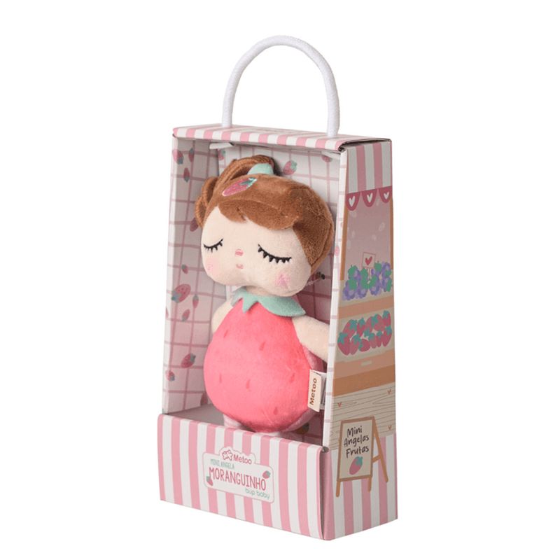 Boneca MeToo Mini Angela Frutas Moranguinho A Mini Angela Moranguinho da Metoo é puro encanto! Com seu corpinho temático de morango, ela traz um ar divertido e delicado, sendo a companheira ideal para os momentos de sono ou para as brincadeiras cheias de imaginação. Seu toque aveludado e as cores vibrantes tornam essa bonequinha perfeita para decorar o quartinho, compor temas de festas e presentear com muito carinho. E o melhor: é colecionável e feita com pelúcia super macia. Uma verdadeira doçura que vai conquistar todos à primeira vista! ATENÇÃO: Este produto é original Metoo. Possui etiqueta em português, selo antifraude e toda a segurança comprovada pelo INMETRO. ESPECIFICAÇÕES: Recomendado para crianças de todas as idades a partir de 0 meses; Este brinquedo não tem restrição de idade; Toque aveludado e olhos fechados, pensado para acalmar os bebês. COMPOSIÇÃO: 100% poliéster e enchimento 100% fibra de poliéster. MEDIDAS APROXIMADAS: Cabeça e corpo: 14 cm. Cabeça até o pé: 20 cm. LIMPEZA E MANUTENÇÃO: Aconselhamos lavar à mão. Caso use a máquina de lavar, indicamos rotação leve e temperatura máxima de 30º; Não limpar a seco; Não usar a secadora. SOBRE A MARCA: A Metoo é uma marca chinesa, criada em 2004, com o intuito de adicionar um toque de felicidade à nossa vida. Combinando os designs mais fofos e os materiais mais confortáveis, a Metoo projeta, desenvolve, fabrica e comercializa brinquedos de pelúcia e acessórios para a casa de alta qualidade. A filial brasileira da Metoo desenvolve produtos exclusivos com todo o toque de sofisticação, primando pela qualidade e segurança dos nossos pequenos. As bonecas de pano são colecionáveis, indicadas desde RN, perfeitas para decorar ambientes infantis e presentear crianças e bebês. Uma mais linda que a outra, a marca possui também diversos acessórios, pelúcias e modelos de bonecos para meninos. Conheça a coleção completa!