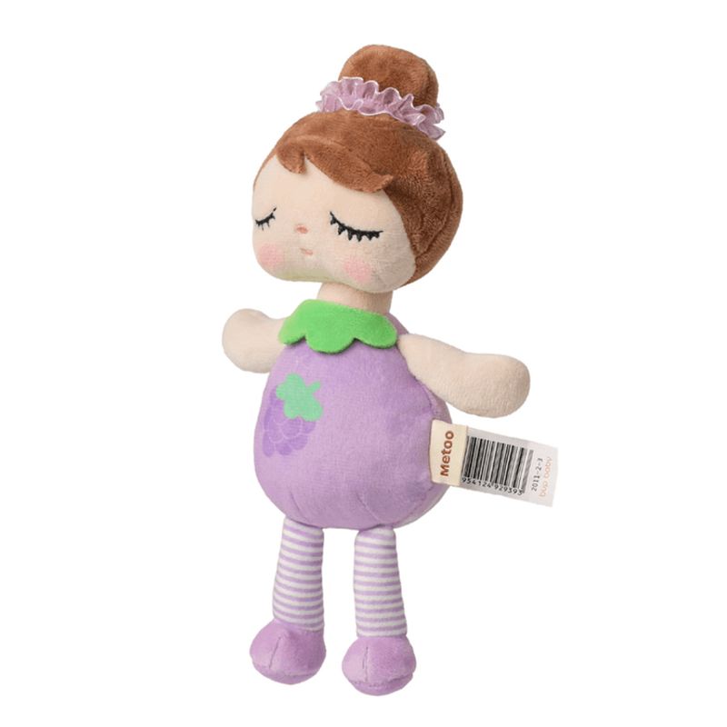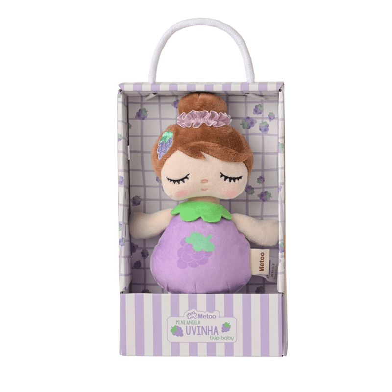 Boneca Metoo Mini Angela Frutas Uvinha A Mini Angela Uvinha da Metoo é puro encanto! Com seu corpinho temático de uva, ela traz um ar divertido e delicado, sendo a companheira ideal para os momentos de sono ou para as brincadeiras cheias de imaginação. Seu toque aveludado e as cores vibrantes tornam essa bonequinha perfeita para decorar o quartinho, compor temas de festas e presentear com muito carinho. E o melhor: é colecionável e feita com pelúcia super macia. Uma verdadeira doçura que vai conquistar todos à primeira vista! ATENÇÃO: Este produto é original Metoo. Possui etiqueta em português, selo antifraude e toda a segurança comprovada pelo INMETRO. ESPECIFICAÇÕES: Recomendado para crianças de todas as idades a partir de 0 meses; Este brinquedo não tem restrição de idade; Toque aveludado e olhos fechados, pensado para acalmar os bebês. COMPOSIÇÃO: 100% poliéster e enchimento 100% fibra de poliéster. MEDIDAS APROXIMADAS: Cabeça e corpo: 14 cm. Cabeça até o pé: 20 cm. LIMPEZA E MANUTENÇÃO: Aconselhamos lavar à mão. Caso use a máquina de lavar, indicamos rotação leve e temperatura máxima de 30º; Não limpar a seco; Não usar a secadora. SOBRE A MARCA: A Metoo é uma marca chinesa, criada em 2004, com o intuito de adicionar um toque de felicidade à nossa vida. Combinando os designs mais fofos e os materiais mais confortáveis, a Metoo projeta, desenvolve, fabrica e comercializa brinquedos de pelúcia e acessórios para a casa de alta qualidade. A filial brasileira da Metoo desenvolve produtos exclusivos com todo o toque de sofisticação, primando pela qualidade e segurança dos nossos pequenos. As bonecas de pano são colecionáveis, indicadas desde RN, perfeitas para decorar ambientes infantis e presentear crianças e bebês. Uma mais linda que a outra, a marca possui também diversos acessórios, pelúcias e modelos de bonecos para meninos. Conheça a coleção completa! Código Inmetro: 003702/2019