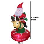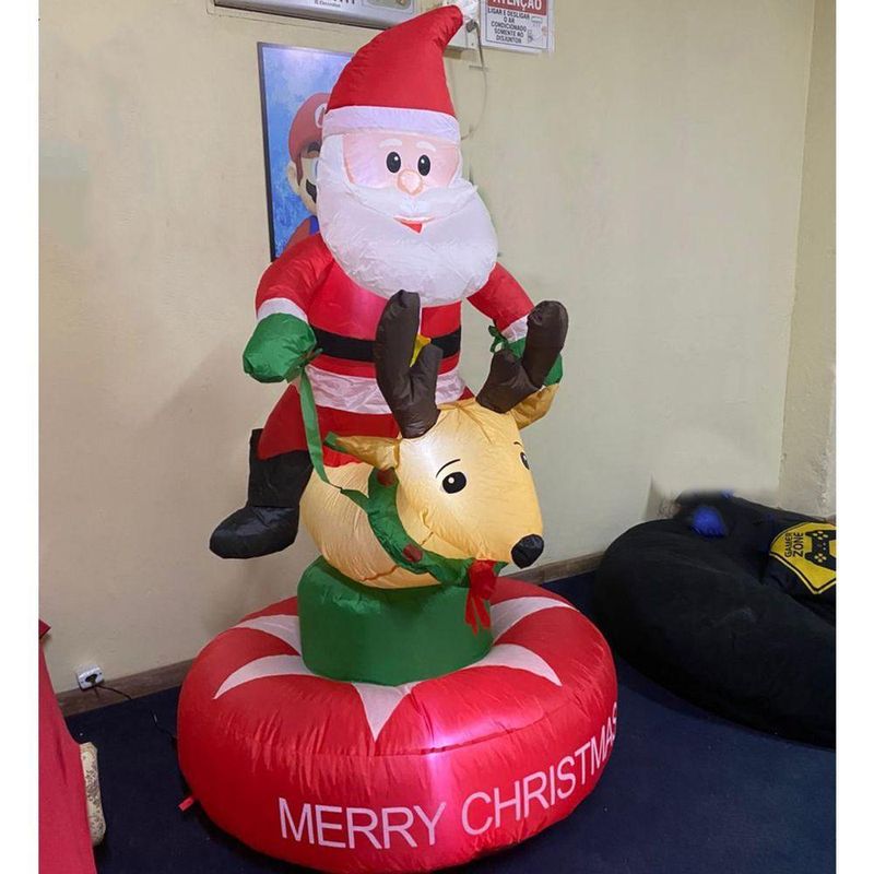 Boneco Inflavel De Natal Papai Noel Rena Natalino Gigante Decoraçao Loja Shopping Evento Fim De Ano Hall Entrada VitrineTransforme sua decoração natalina em um verdadeiro espetáculo de luz e alegria com este Papai Noel inflável gigante de 1 Metro e 80cm montado em uma linda rena iluminada por LEDs brilhantes!Um design encantador e cheio de detalhes, este inflável cria instantaneamente uma atmosfera festiva e acolhedora, perfeita para destacar seu espaço interno ou externo. A iluminação LED embutida dá um toque mágico durante a noite, atraindo todos os olhares e espalhando o espírito natalino por onde passa.Crie momentos inesquecíveis com a presença mágica deste Papai Noel inflável na rena com LED. É impossível não sorrir ao vê-lo iluminando sua decoração e encantando adultos e crianças!CaracterísticasCor: VermelhoMaterial: PoliesterLuzes Led InternaTempo para inflar: De 5 a 10 minutosInflador automáticoVoltagem: 110-220vPapai Noel SimpáticoRena NatalinaDecoraçao de NatalEnfeite Merry ChristmasFácil de montarDecoraçãoFim de AnoDimensões AproximadasAltura: 1 Metro e 80cmLargura: 90cmConteúdo da Embalagem1 Papai Noel inflável montado na Rena1 Fonte3 Meses de Garantia Contra Defeitos de Fabricação.*2218G Mod: SU-INFLA5