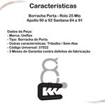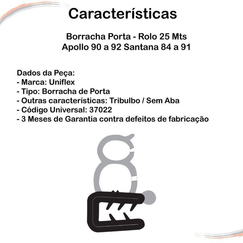 Borracha Porta Apollo 90 A 92 Santana 84 A 91 Rolo 25 Mts [f103]CONTEÚDO DA EMBALAGEM- Borracha Da Porta - Sem Aba - Tribulbo - Rolo De 25 MtsAPLICAÇÃO NOS SEGUINTES VEÍCULOS:FORD:- Escort 88 a 92 - 2 Portas- Verona 89 a 92 - 2 PortasGM:- Monza Hatch 82 a 88 - 2 Portas- Chevette 73 a 88 - 2 e 4 Portas- Marajó 80 a 89- Chevy 88 a 92VOLKSWAGEN:- Apollo 90 a 92- Santana GI 84 a 91 - 2 Portas- Quantum GI 85 a 91- Gol GI 88 a 94- Voyage GI 88 a 96- Parati GI 80 a 96- Saveiro GI 82 a 97ESPECIFICAÇÕESMarca: UniflexCódigo Universal do Produto (EAN): 7895272370226Código IPI: 4234Código NCM: 40082900SKU Universal: 37022Garantia do Fabricante: 3 Meses contra defeitos de fabricaçãoInstalação:Este é um produto técnico e deve ser aplicado por um profissional, assim se garantia a longa vida útil do mesmo.HistóriaA Shoppeças é uma empresa especializada em E-COMMERCE, e disponibilizamos um portfólio de mais de 30 mil itens no setor Automotivo, nos segmentos de ferragens automotivas (fechaduras, maçanetas, cilindros, trincos de quebra vento), máquinas do vidro elétricas e manuais, tampas automotivas, borrachas de vedação, linha de suspensão e direção, amortecedores mola a gás, acessórios automotivos e palhetas. Todos com portfólio completo para linha leve, pesada, pick-ups e vans.EnviosRealizamos todos os nossos envios em até 24 horas após o faturamento.VolkswagemGMFord -- Compra 100% segura | Envio rápido | Suporte dedicado