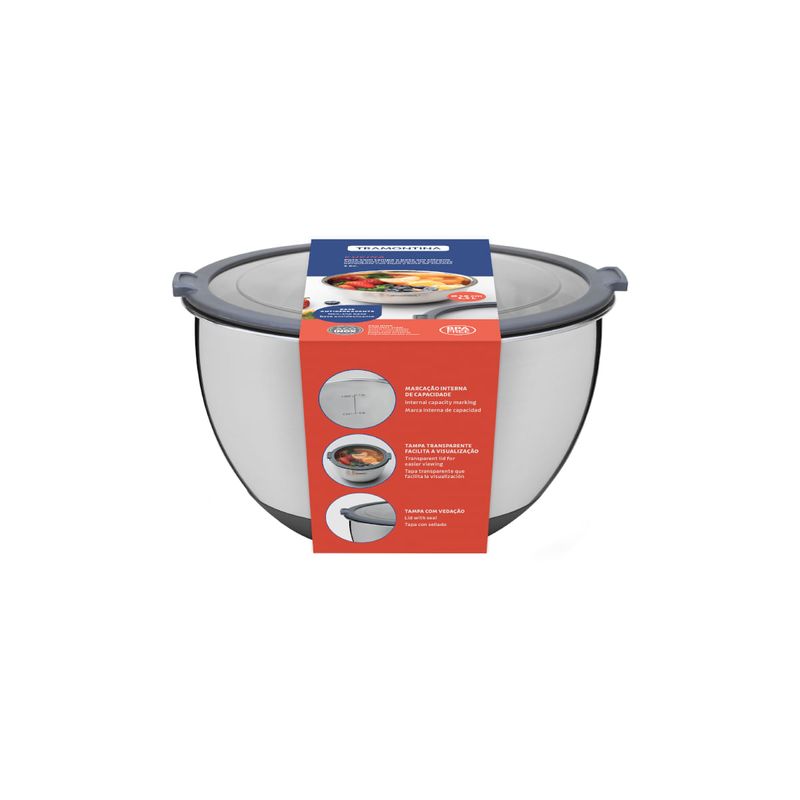 O bowl Tramontina Cucina em aço inox 1,5 L é a escolha perfeita para quem busca qualidade e praticidade na cozinha. Fabricado em aço inoxidável de alta qualidade, este bowl é durável, higiênico e fácil de limpar, garantindo que seus alimentos fiquem protegidos e conservados da melhor forma. Sua tampa transparente com vedação hermética assegura um fechamento perfeito, preservando o frescor e a qualidade dos alimentos por mais tempo, além de permitir visualizar o conteúdo sem abrir. Com base de silicone antiderrapante, proporciona maior segurança durante o preparo, evitando que o bowl deslize na bancada. Compacto e funcional, é ideal para o preparo de ingredientes ou armazenamento de alimentos, tornando seu dia a dia na cozinha ainda mais prático.