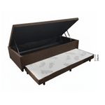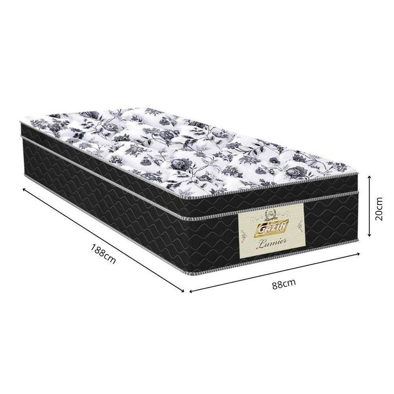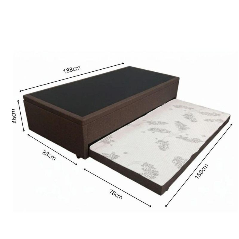 Box Baú Solteiro Com Colchão Gazin Molas Bonnel Tabaco/pretoO Conjunto Box Bau Solteiro com Cama Auxiliar e Colchao Gazin Molas Bonnel e a escolha perfeita para quem busca conforto, praticidade e aproveitamento de espaco. Ideal para quartos compactos ou ambientes multifuncionais, esse conjunto une elegancia, funcionalidade e durabilidade em um unico produto.A Base Box Bau Prince conta com estrutura reforcada em madeira de reflorestamento tratada, garantindo resistencia e estabilidade. Seu sistema de abertura com pistoes a gas oferece facilidade no manuseio, tornando o acesso ao amplo compartimento interno muito mais pratico. Alem disso, a cama auxiliar embutida com rodizios e ideal para hospedes, proporcionando uma solucao inteligente para o dia a dia.O Colchao Gazin Molas Bonnel complementa o conjunto com conforto de alto nivel. Produzido com molas de aco temperado e camada de espuma de densidade equilibrada, ele oferece suporte anatomico e conforto firme na medida certa. O revestimento em malha respiravel com tratamento antialergico e antiacaro garante noites de sono mais saudaveis e tranquilas.Este conjunto e perfeito para quem valoriza qualidade, design e versatilidade, proporcionando um ambiente mais organizado e aconchegante.Manutencao e Cuidados: limpe a superficie com pano seco ou levemente umedecido. Evite exposicao direta ao sol e produtos abrasivos. Gire o colchao periodicamente para melhor conservacao.Colchao Solteiro Gazin Molas Bonnel Lumier 0,88x1,88x0,20Caracteristicas:Molas: BonelCapacidade de peso: 90 kgDimensoesAltura: 20 cmLargura: 88 cmProfundidade: 188Peso: 14,08 kgGarantia: 12 mesesBase Box Bau com Cama Auxiliar PrinceCaracteristicas:Marca: PrinceModelo: Bau com Cama AuxiliarTipo: Base Box SolteiroEstrutura: Madeira de reflorestamento tratadaSistema de abertura: Pistao a gas (abertura leve e segura)Cama auxiliar: Estrutura metalica com rodizios embutidosCapacidade de peso: Ate 120 kg na cama principal / 100 kg na cama auxiliarIdeal para: Colchao solteiro 88x188 cmDimensoes:Altura: 46 cmLargura: 0,88 cmProfundidade: 1,88 cmPeso: 39 KgGarantia: 12 mesesObservacao: Base 40cm / Pes 6cm = 46cm
