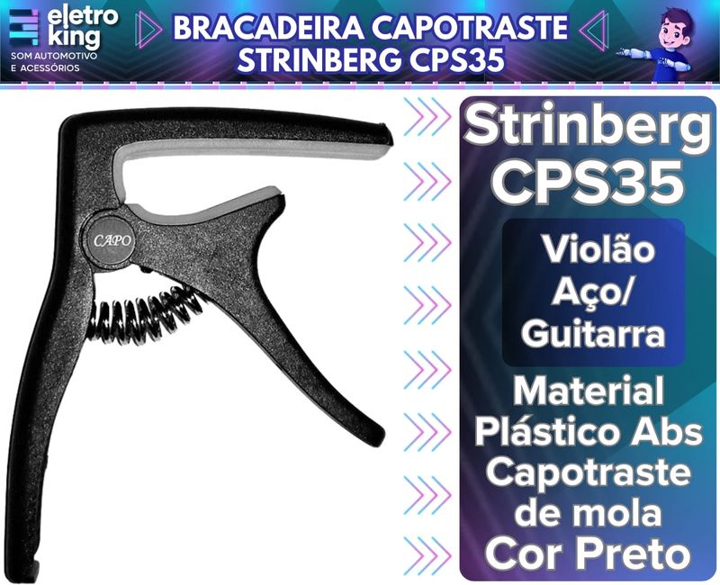 Braçadeira Capotraste Strinberg CPS35 A Braçadeira/Capotraste para Violão CPS-35 da STRINBERG foi desenvolvida para violões com encordoamento de aço ou nylon com o objetivo de tornar o seu manuseio o mais fácil possível. Especificações Técnicas: • Modelo: Cps-35 • Marca: Strinberg • Aplicação: Violão Guitarra • Tipo: Capotraste de mola, fácil utilização • Material: Plástico • Cor: Preto Conteúdo da Embalagem: • 01 Braçadeira Capotraste Strinberg CPS35 Importante: • Garantia de 90 Dias. • Valor Unitário. • Todos os Nossos Produtos São Novos, Originais e Acompanham Nota Fiscal. • A Eletroking recomenda que a instalação seja feita por profissional especializado e não se responsabiliza pelo mau uso do produto.