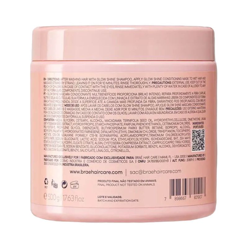 Braé Glow Shine - Máscara Capilar 500g A Braé Glow Shine Máscara Capilar foi criada para trazer brilho intenso, nutrição e recuperação profunda aos cabelos. Sua fórmula de alto desempenho é rica em ativos que agem de forma eficaz, restaurando o brilho natural, alinhando os fios e proporcionando maciez e sedosidade. Ideal para cabelos opacos, sem vida ou danificados, ela devolve a vitalidade aos fios, deixando-os radiantes, suaves e saudáveis. Características: Marca: Braé Linha: Glow Shine Categoria: Máscara Capilar de Brilho Versão: Hidratação e Recuperação do Brilho Natural Benefícios: Recuperação do brilho intenso e natural Hidratação profunda e nutrição intensiva Fios mais alinhados e sem frizz Ação antioxidante que protege contra danos externos Cabelos macios, sedosos e radiantes Ingredientes Principais: Óleo de Argan: Rico em ácidos graxos essenciais, promove hidratação, brilho e fortalecimento dos fios Vitamina E: Antioxidante que combate os danos causados pelos radicais livres, preservando a saúde dos cabelos Manteiga de Karité: Hidratação profunda, recuperação e selagem das cutículas capilares Modo de Aplicação: Após lavar os cabelos com o Shampoo Glow Shine, aplique a máscara nos fios ainda úmidos, distribuindo uniformemente. Massageie suavemente e deixe agir por 5 a 10 minutos. Enxágue bem e finalize conforme desejado. Para melhores resultados, utilize a linha completa Braé Glow Shine. Benefícios do Produto: Eficácia: Restauração e brilho imediato para cabelos opacos e danificados. Durabilidade: A hidratação e o brilho duram por mais tempo, mantendo os fios saudáveis. Versatilidade: Ideal para todos os tipos de cabelo que necessitam de brilho e hidratação. Design e Praticidade: Embalagem de 500g, ideal para uso prolongado ou salão de beleza. A Braé Glow Shine Máscara Capilar é a escolha perfeita para quem deseja cabelos luminosos, hidratados e saudáveis. Com ativos poderosos e alta performance, ela devolve a vitalidade e o brilho natural aos fios, garantindo resultados incríveis a cada aplicação.
