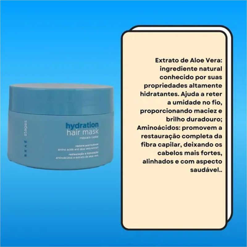 Braé Stages Máscara Hidratação 200ml: Hidratação Profunda para Cabelos SaudáveisIntrodução:Descubra o poder da Braé Stages Máscara Hidratação 200ml, o tratamento semanal que transforma seu cronograma capilar. Esta máscara capilar de alta performance penetra profundamente nos fios, repondo a hidratação e recuperando a maciez perdida. Em poucos minutos, seus cabelos ficam mais saudáveis, com brilho intenso e muito mais maleáveis. É o aliado perfeito para um cabelo sempre hidratado e nutrido, revelando uma beleza radiante a cada uso.Ingredientes e Composição:A fórmula avançada da Braé Stages Máscara Hidratação é enriquecida com ativos poderosos para resultados visíveis:Extrato de Aloe Vera: Conhecido por suas propriedades altamente hidratantes, ajuda a reter a umidade nos fios, proporcionando maciez e um brilho duradouro.Aminoácidos: Essenciais para a restauração completa da fibra capilar, deixam os cabelos mais fortes, alinhados e com um aspecto visivelmente saudável.Modo de Usar:Para obter os melhores resultados com sua máscara Braé Stages, siga estes passos simples:Após lavar o cabelo com o shampoo, retire o excesso de água com uma toalha.Aplique a máscara no comprimento e pontas, massageando suavemente.Deixe agir por 5 minutos para uma hidratação completa.Enxágue bem e, se desejar, finalize com o condicionador para um resultado ainda mais poderoso.Benefícios:A Braé Stages Máscara Hidratação oferece múltiplos benefícios para a saúde e beleza dos seus cabelos:Hidratação Profunda: Repõe a umidade essencial, combatendo o ressecamento.Brilho Intenso: Deixa os fios luminosos e com aspecto saudável.Maciez: Proporciona toque sedoso e suavidade incomparável.Reparação: Ajuda a restaurar a fibra capilar danificada.Fortalecimento: Contribui para cabelos mais resistentes e menos propensos à quebra.Maleabilidade: Facilita o desembaraço e o penteado.Indicação:Ideal para todos os tipos de cabelo que necessitam de hidratação e reparação, a Braé Stages Máscara Hidratação é perfeita para:Cabelos SecosCabelos DanificadosCabelos Quimicamente TratadosCabelos TingidosCabelos CacheadosCabelos LisosCabelos CresposEste produto é a solução para cabelos que buscam vitalidade, força e um aspecto renovado.Principais Dúvidas:A Braé Stages Máscara Hidratação é um produto de alta qualidade e segurança:Cruelty-Free: SimDermatologicamente Testado: SimTextura: CremeTipo de Embalagem: PoteSobre Nós:Na Negabella, temos o compromisso de oferecer produtos de beleza que elevam sua rotina de cuidados. Trabalhamos com marcas renomadas como a Braé, garantindo qualidade, inovação e praticidade em cada item. Sua satisfação é nossa prioridade, e estamos aqui para ajudar você a encontrar as melhores soluções para seus cabelos. Se sua compra for um presente, podemos enviar com uma embalagem especial; basta nos informar após a compra. Conte com a Negabella para uma experiência de compra excepcional!