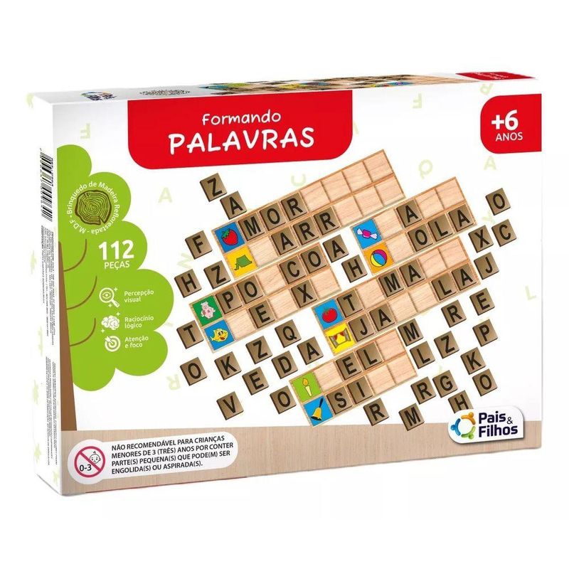 Um Jogo Interessante, Acompanhado de Várias Letras de Madeira Soltas e Plaquinhas Para a Criança Formar Palavras. nas Plaquinhas Tem Desenhos Onde a Criança Vai Montar As Palavras de Acordo com o Desenho, ou Pode Montar Qualquer Outras Palavras. Especificações: • Referência: 2906 • Marca: Pais e Filhos • Cor: Colorido • Modelo: Formando Palavras • Material: Madeira • Quantidade de Peças: 140 Peças • Recomendação: Para crianças a partir de +06 anos • Restrição de Idade: Não recomendável para menores de 03 anos por conter peças pequenas que podem ser engolidas • Garantia do Fornecedor: 03 meses contra defeitos de fabricação • Validade: Indeterminada • Produto Certificado Compulsório: 003 726/2019 OCP 0046 CE-BRIC/ICEPEX-N 01264-25 • Desenvolvimento Pedagógico: Capacidade visual, percepção cromática, sensibilidade tátil, coordenação manual, coordenação motora, capacidade cognitiva, imaginação e fantasia, interação entre pais e filhos, estimula criatividade! Itens Inclusos: • 01 Jogo Educativo Formando Palavras 140 Peças *As cores podem variar entre as imagens mostradas acima e o produto. Imagens meramente ilustrativas.