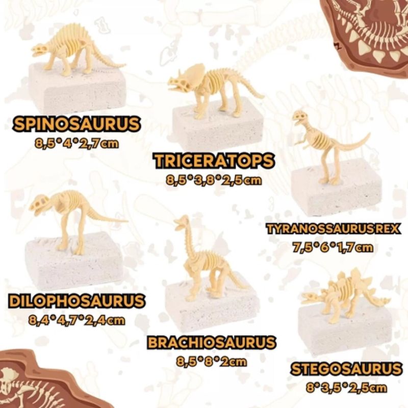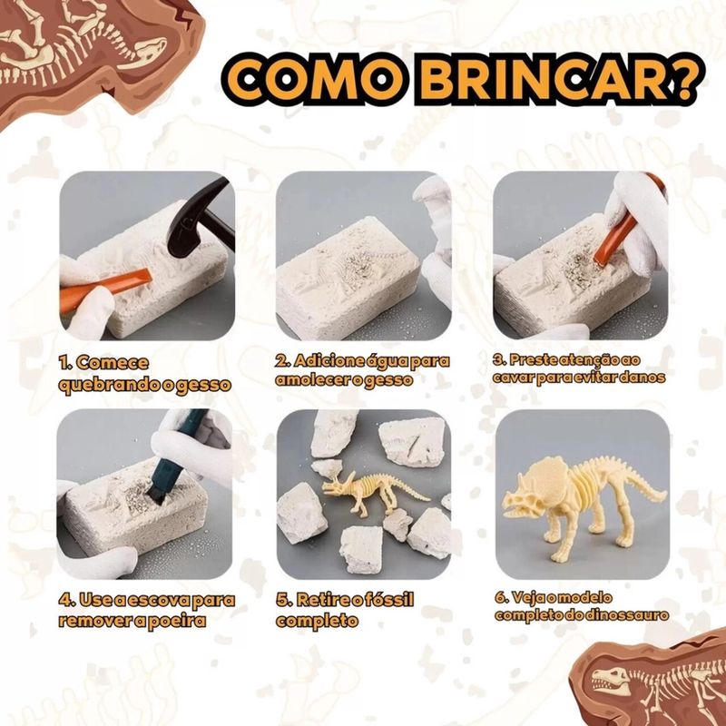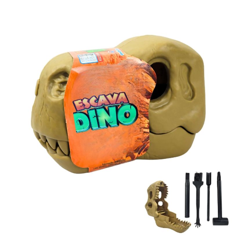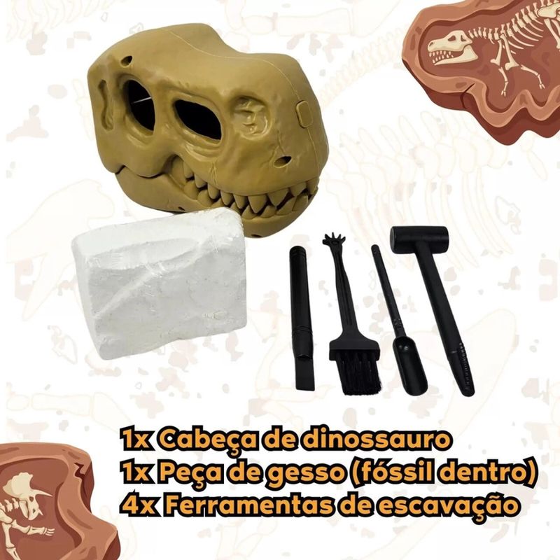 Aviso: Imagens meramente ilustrativas!! Esse brinquedo vai mexer com a imaginação e criatividade dos pequenos e curiosos exploradores. O dinossauro surpresa esta dentro da pedra, que deve ser escavada com as ferramentas para poder encontrá-lo. Com Escava Dino as horas de diversão são garantidas. Você poderá brincar com eles seguindo suas histórias ou colecionar pelo tempo que quiser. Conteúdo da embalagem: 01 Cabeça de Dinossauro (abre a boca) 01 Fóssil de gesso com 01 dinossauro surpresa de plástico 04 Ferramentas de escavação de plástico Composição: Plástico e Gesso Idade Recomendada: 3+ Anos Marca: Polibrinq