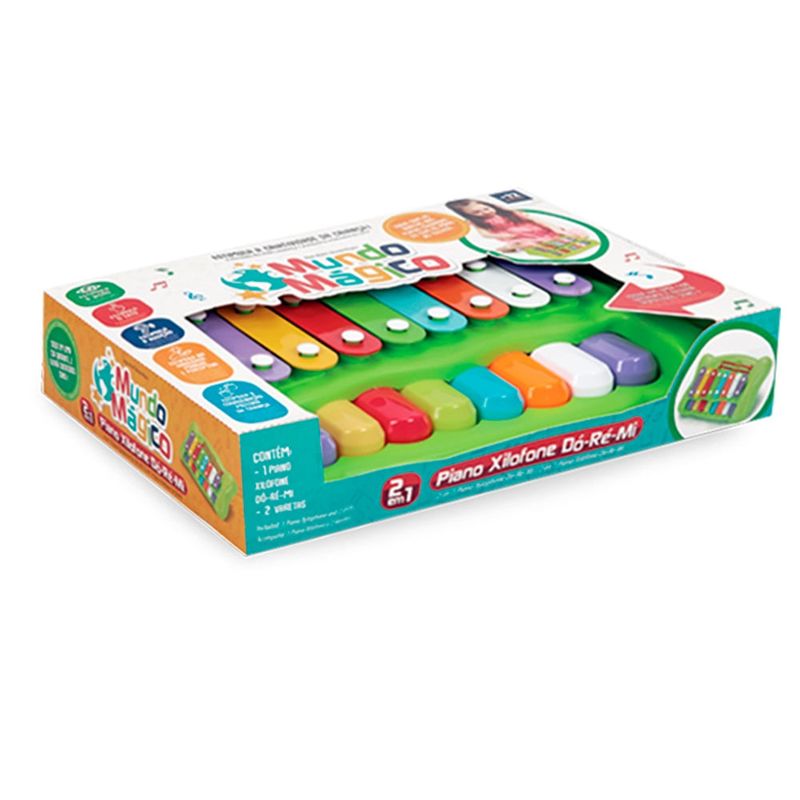 Brinquedo Infantil Piano Xilofone 2 em 1 Mundo Mágico Do-Ré-Mi O que é? O Brinquedo Infantil Piano Xilofone 2 em 1 Mundo Mágico Do-Ré-Mi é uma incrível combinação de piano e xilofone, projetado para despertar a criatividade e a sensibilidade musical das crianças. Com um design colorido e atraente, ele é ideal para crianças a partir de 3 anos, promovendo a diversão e o aprendizado ao mesmo tempo. Para que serve? Este brinquedo multifuncional não apenas proporciona horas de entretenimento, mas também ajuda no desenvolvimento cognitivo e motor dos pequenos. Ao tocar as teclas do piano e as barras do xilofone, as crianças aprimoram a coordenação motora, a percepção auditiva e a memória musical. Benefícios Desenvolvimento Musical: Estimula a criatividade e o gosto pela música desde cedo.Coordenação Motora: A interação com o piano e xilofone aprimora a habilidade motora fina.Diversão e Aprendizado: Com sons envolventes e cores vibrantes, o brinquedo mantém as crianças engajadas enquanto aprendem.Material Seguro: Fabricado com materiais não tóxicos, garantindo a segurança durante o uso. Modo de usar Para usar o Brinquedo Infantil Piano Xilofone 2 em 1, basta colocar o brinquedo em uma superfície plana e incentivar a criança a explorar as diferentes teclas e barras. As crianças podem experimentar tocar melodias simples ou até mesmo criar suas próprias músicas. Modo de conservação Mantenha o brinquedo limpo e seco. Utilize um pano úmido para limpar a superfície externa. Armazene em um local seco e arejado, evitando exposição direta à luz solar ou à umidade excessiva para prolongar a durabilidade do produto. Advertências Uso sob supervisão de um adulto. Não deixar crianças menores de 3 anos brincando sem a supervisão de um responsável, devido a peças pequenas que podem ser ingeridas.Não expor a altas temperaturas ou umidade.