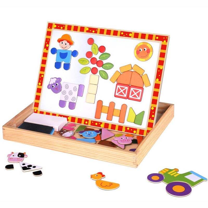 Brinquedo Magnético Quebra-cabeça e Lousa - Fazenda - Tooky Toy De um lado brincamos de desenhar na lousa do outro um painel magnético para libertar a imaginação, as peças são fixadas no painel magneticamente. Com as peças conseguimos montar um celeiro, 1 vaca, 1 porco, 1 cavalo, 1 ovelha, 1 galinha, 1 trator, 1 árvore, 1 cerca, 1 fazendeiro e 1 sol. Após montar a fazenda é só virar o painel e se divertir na lousa. Ref.: TKF014. Material: madeira. Conteúdo da embalagem: 1 painel magnético, 1 apagador, giz, e diversas peças para montar a fazenda. Medidas do produto: (C x A x L) 30 x 23 x 21 cm. Medidas da embalagem: (C x A x L) 30 x 23 x 21 cm. Embalagem: caixa de papelão. Peso aproximado do produto: 0,670 Kg. Idade: a partir de 3 anos. Prazo de garantia: 03 meses de garantia legal. Pode ocorrer variação nas cores ou detalhes das imagens apresentadas para o produto. Todas as informações fornecidas são de responsabilidade do fabricante. "A criatividade é inteligência divertida. "- Albert Einstein. Com isso em mente, a Tooky Toy surgiu em 2004 para encontrar alternativas criativas para os brinquedos de madeira, criar os melhores brinquedos de madeira possíveis. Os brinquedos da Tooky Toy crescem com seu filho, incentivam a imaginação, incorporam habilidades reais e desenvolvem habilidades motoras finas. Todos os brinquedos são fabricados de forma ecológica. Eles se encontram e, na maioria dos casos, excedem os padrões internacionais de segurança de brinquedos mais rigorosos. A Tooky Toy tornou-se uma das empresas de brinquedos de madeira de maior crescimento na Europa e nos EUA.