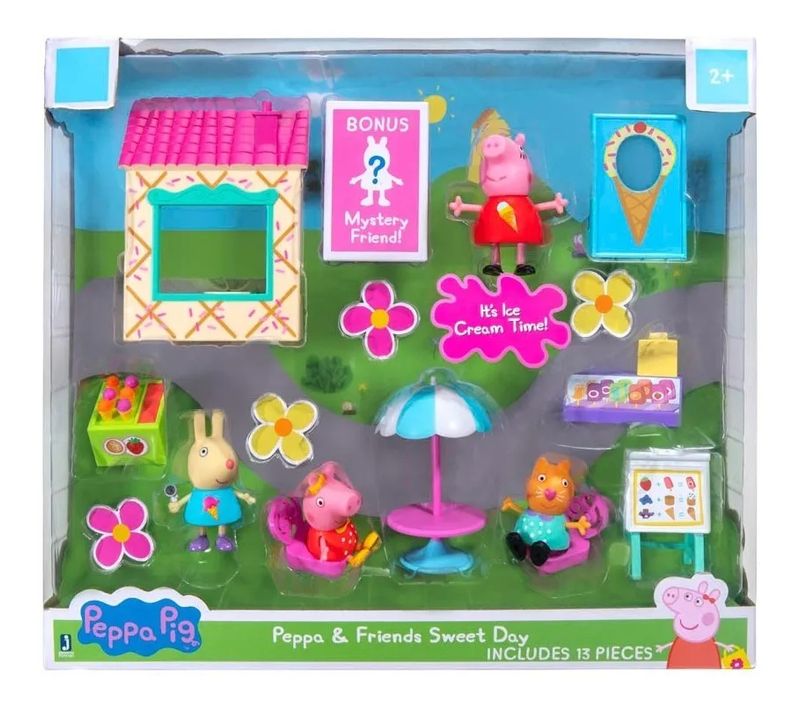 Eu quero, você quer, todos nós queremos o Dia divertido da Peppa com sorvete! Cada figura usa uma roupa de sorvete exclusiva! Há tantas combinações deliciosas de sorvete para escolher no cartão de sorvetes. Na sorveteria você pode escolher um sabor delicioso para você e seus amigos e, em seguida, pagar tudo no caixa. Desfrute do seu sundae de sorvete sob a mesa do guarda-sol antes que ele derreta. Quando terminar de comer, coloque seus personagens Peppa atrás da parede de fotos para tirar fotos divertidas! Um tempo doce espera por você com o Dia Divertido da Peppa com o Ice Cream Playset Sweet Day. Conteúdo da embalagem: - Peppa Pig, Mum Pig, Molly Kitty, Luisa Spoon e um personagem Surpresa - Mesa com Guarda-Sol, - 2 Cadeiras - Cavalete - Parede de Fotos - Sorveteiro - Caixa Registradora - Playhouse. Medidas da embalagem: Comprimento: 36 cm Largura: 31 cm Altura: 8 cm Peso: 0,510kg. AVISOS IMPORTANTES: Idade Recomendada: A partir de 3 anos de idade. As cores e medidas podem variar entre as imagens e especificações mostradas acima. Garantia: 90 dias por defeito de fabricação. A garantia não cobre defeitos ou danos causados pelo uso indevido. Brinquedos com certificado de segurança pelo INMETRO. INMETRO CE-BRI/INNAC 00128-05A NM 300/2002