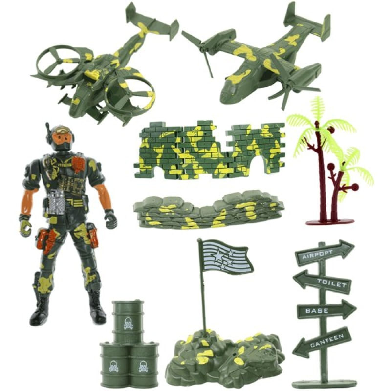 Brinquedos Miniaturas Militares Bonecos Veículos 12 Peças - Conteúdo da embalagem: 01 Bonecos soldados em miniatura - Altura:14,5cm 01 Mureta de saco - Comprimento: 13cm 03 Paredes de tijolos - Comprimento total: 19,5cm 01 Avião - Comprimento: 12cm 01 Helicóptero - Comprimento: 13cm 01 Palmera - Altura:6cm 04 Acessorios Ficha técnica: Material: Plástico abs. Características Gerais do Produto: Garantia: • Garantia do site - 1 Mês