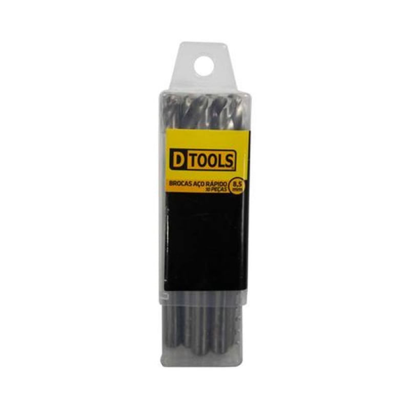 Broca Aço Rápido 8,50mm - Ponta Autocentrante - DTools - BROCA AÃO RÃPIDO (Q) 8,50MM - DTOOLSDESCRIÃÃO PERSUASIVA:A broca de aço rápido da DTOOLS Universo do Lar é o acessório perfeito para suas necessidades de perfuração. Com afiação ''Split Point'' de 135°, ela é 50% mais rápida do que as brocas convencionais, proporcionando mais eficiência e agilidade em seus projetos. Sua ponta autocentrante facilita o inÃcio da furação, enquanto sua construção fresada e retificada permite a retirada do resÃduo com mais facilidade. Feita com aço rápido de alta qualidade, com uma dureza de 62 à 64 HCR, essa broca garante um corte rápido e preciso em diversos materiais.RESUMO EM DESTAQUES:- Afiação ''Split Point'' de 135° para 50% mais rapidez- Ponta autocentrante que facilita o inÃcio da furação- Construção fresada e retificada para remoção fácil de resÃduos- Feita com aço rápido de alta qualidade (62 à 64 HCR)- Garante corte rápido e precisoINFORMAÃÃES TÃCNICAS:- Modelo: Broca Aço Rápido (Q)- Diâmetro: 8,50mm- Marca: DTOOLS- Material: Aço Rápido- Dureza: 62 à 64 HCR- Tipo de corte: RápidoGARANTIA:Invista na qualidade e eficiência da DTOOLS Universo do Lar e tenha a garantia de um produto durável e de alto desempenho para suas necessidades de perfuração. -------- Descrição Original enviada pelo Fornecedor: BROCA AÃO RÃPIDO (Q) 8,50MM - DTOOLSAfiação ''Split Point'' 135° - 50% mais rápidaPonta autocentrante , facilita o inÃcio da furaçãoFresada e retificada , retira o resÃduo com mais facilidadeAço rápido de alta qualidade - 62 à 64 HCR (dureza da broca)Corte RápidoQuantidade da embalagem: 10 Características Gerais do Produto: Garantia: • 3 meses