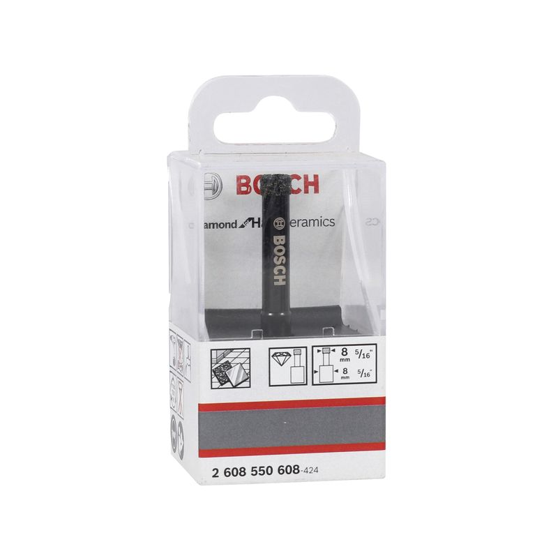 Precisando perfurar materiais duros como Porcelanato e cerâmica? A Broca Diamantada Bosch é a solução! Com ela, um furo de 8mm de diâmetro e 65mm de comprimento máximo está garantido. Além disso, acompanha um encaixe Cilíndrico para utilização em Furadeiras. Produto Broca Uso Indicado Para Porcelanato Tipo de Broca Diamantada Tipo Diamantada Marca Bosch Ferramenta de Uso e Operação Furadeira Material a ser Trabalhado Cerâmica e Porcelanato Altura 65,00 mm Largura 8,00 mm Profundidade 8,00 mm Comprimento 65,00 mm Diâmetro 8,00 mm Espessura 8,00 mm Dimensão 65x8x8 mm Altura em Polegadas 2.5/9 " Largura em Polegadas 1/3 " Profundidade em Polegadas 1/3 " Comprimento em Polegadas 2.5/9 " Diâmetro em Polegadas 1/3 " Espessura em Polegadas 1/3 " Dimensão em Polegadas 2.5/9x1/3x1/3 " Produto Acompanha Embalagem Sim Tipo de Embalagem Blister Altura da Embalagem 132,00 mm Largura da Embalagem 49,40 mm Profundidade da Embalagem 45,20 mm Peso do Produto na Embalagem 0,07 Kg Conteúdo da Embalagem 01 unidade - Broca de diamante para furar a úmido Diamond for Hard Ceramics Ø8 x 35 mm Dimensão da Embalagem 132x49,4x45,2 mm Acompanha Prolongador Não Modelo Diamond for Hard Ceramics Tipo de Encaixe Cilíndrico Composição do Material Aço e diamante Aviso Recomendamos o uso equipamentos de proteção individual (EPI's) e nunca substitua broca na furadeira, enquanto a mesma estiver conectada a energia. Dica Para o uso em brocas nos Marteletes e necessário o uso do Mandril aperto Manual ou aperto Automático. Garantia do Fabricante 6 mes(es) Referência do Produto 2608550608