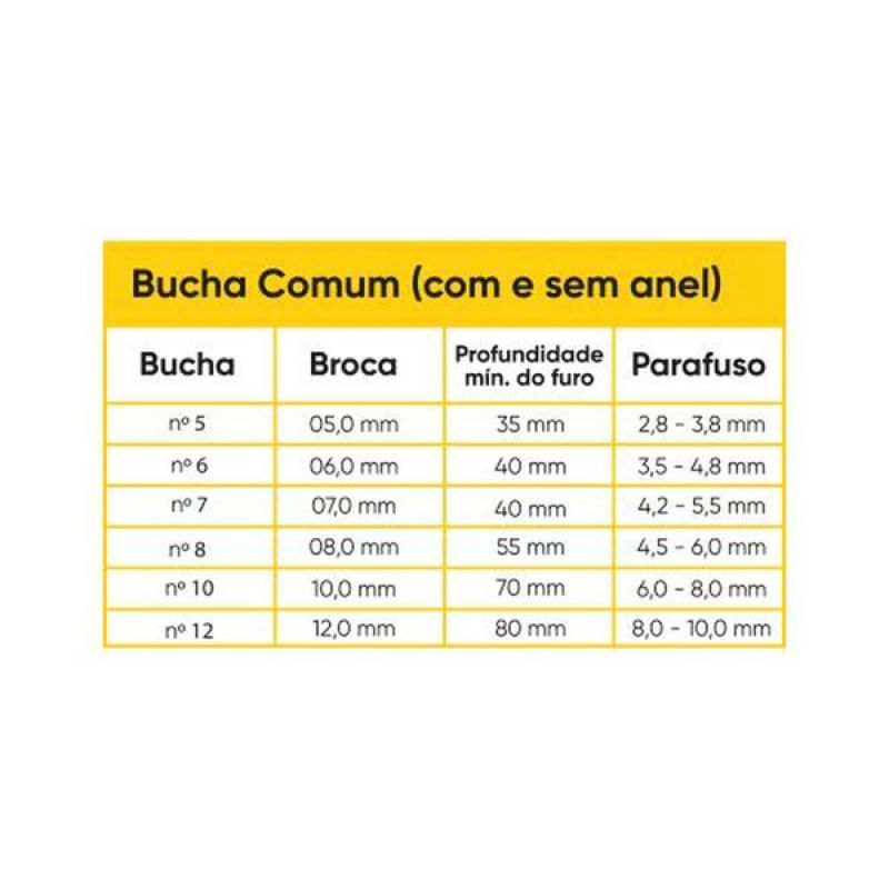 Bucha 7mm Polietileno de Alta Densidade Kit com 1000 Unidades Fixação em Paredes de Tijolo Concreto - BUCHA 7MM - SACO COM 1000 UNIDADES - DTOOLSCom a Bucha 7mm - Saco com 1000 unidades - DTOOLS, você terá em mãos o produto ideal para realizar fixações de forma prática e segura em paredes compactas de tijolo, cimento e concreto. Suas aletas e braços garantem que a bucha não gire dentro do furo, proporcionando uma instalação firme e confiável. Fabricada em polietileno de alta densidade, essa bucha é resistente e durável, garantindo a segurança das suas instalações.Seja para fixar armários, prateleiras, quadros, acessórios de banheiro e muito mais, a Bucha 7mm da DTOOLS é a escolha perfeita para quem busca qualidade e praticidade em suas instalações. Com bitola de 7mm, ela é compatÃvel com parafusos de rosca madeira ou auto atarraxante, facilitando ainda mais o processo de fixação.- Ideal para uso em paredes compactas de tijolo, cimento e concreto- Aletas e braços que evitam a rotação dentro do furo- Produzido em polietileno de alta densidade- Utilizado com parafuso de rosca madeira ou auto atarraxante- Utilizado para fixação de armários, prateleiras, quadros, acessórios de banheiro, etc- Bitola de 7mmEleva a qualidade das suas instalações com a Bucha 7mm - Saco com 1000 unidades - DTOOLS Universo do Lar. Garantia de qualidade e segurança para o seu lar. -------- Descrição Original enviada pelo Fornecedor: BUCHA 7 MM (SACO COM 1000) - DTOOLSIdeal para uso em paredes compactas de tijolo, cimento e concreto.Apresenta aletas e braços que fazem a bucha não girar dentro do furo.Produzido em polietileno de alta densidade.Utilizado com parafuso de rosca madeira ou auto atarraxante.Utilizado para fixação de armários, prateleiras, quadros, acessórios de banheiro, etc.Bitola 7mm. Características Gerais do Produto: Garantia: • 3 meses