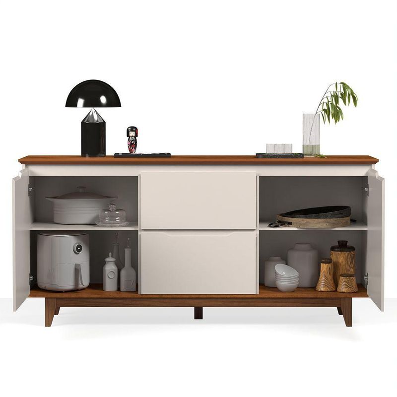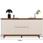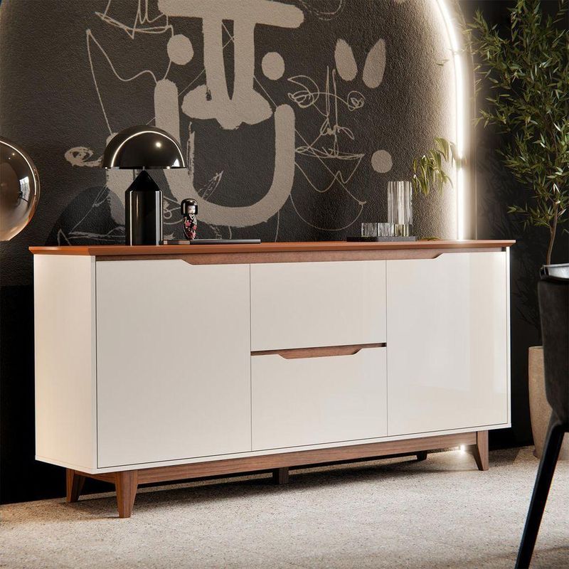 Buffet 2 Portas Flow Off White Com Freijo Com design moderno e linhas elegantes, o Buffet 2 Portas é a escolha ideal para quem busca um móvel sofisticado, funcional e com visual clean.Perfeito para compor salas de jantar, estar ou halls de entrada, o modelo une estética contemporânea e praticidade no uso diá dos seus diferenciais é a régua dupla face, um aplique superior que pode ser montado com dois acabamentos diferentes, permitindo adaptar o visual do móvel conforme o estilo do ém disso, o buffet conta com tampo e portas em MDF usinados, com acabamento refinado que valoriza os detalhes, enquanto a estrutura dos pés em madeira proporciona firmeza, durabilidade e um toque natural.Internamente, oferece amplo espaço para organização, ideal para armazenar louças, utensílios, objetos decorativos ou itens diversos do dia a ões:Altura: 84 cmLargura: 163 cmProfundidade: 40 cmObservações:- Régua dupla face inclusa: escolha o visual que mais combina com seu ambiente - Sem puxadores externos, com design clean e sofisticado - Tampo e portas em MDF usinados, com acabamento de alto padrão - Estrutura dos pés em madeira, com excelente resistência - Amplo espaço interno para organização eficiente, Ideal para salas de jantar, estar, hall ou ambientes sociais