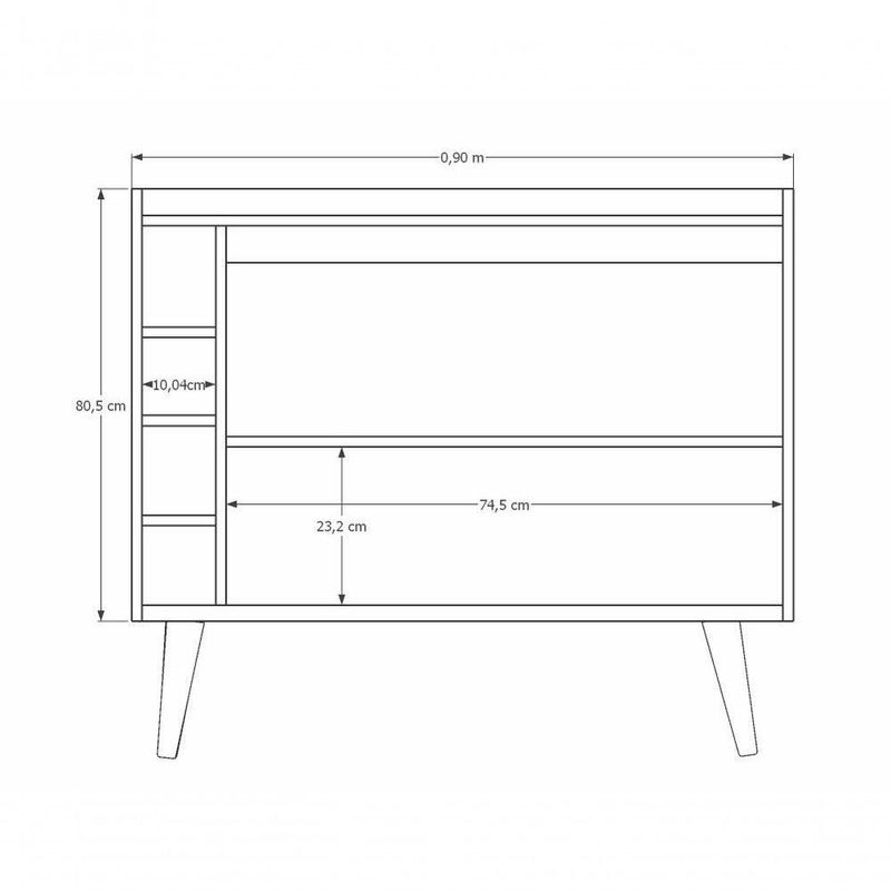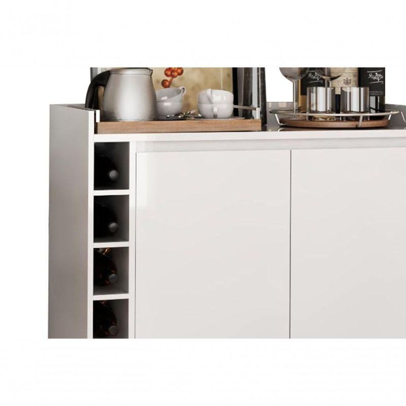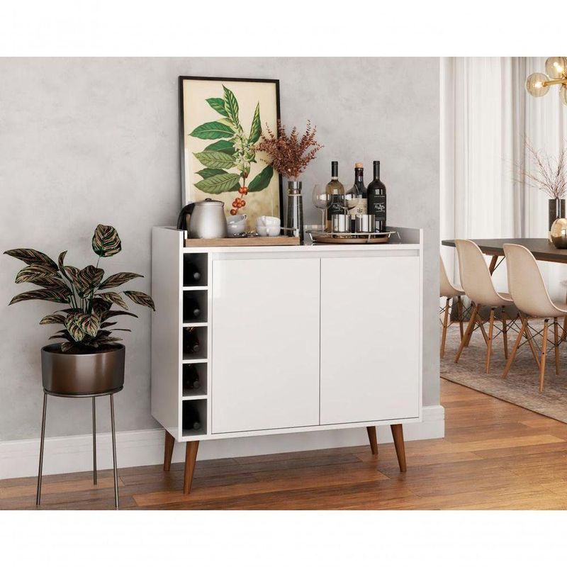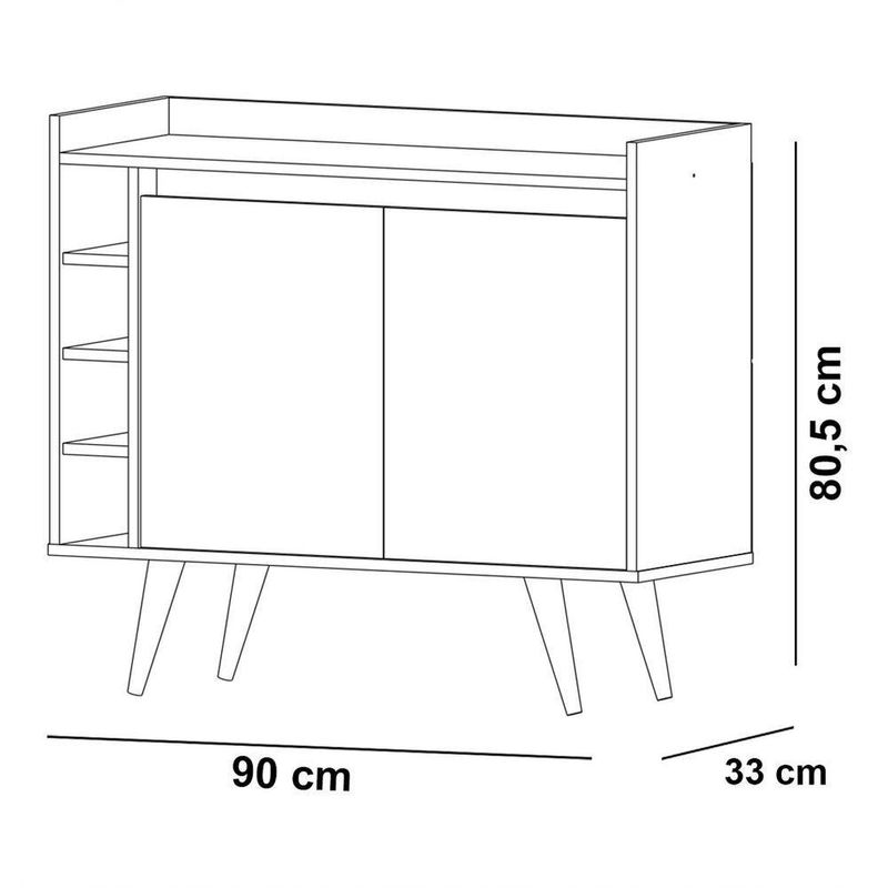 Buffet Aparador Com Adega Retrô Wine 2 Portas Branco - MoveisaquiO Buffet com Adega Wine 2 Portas - MóveisAqui possui um lindo design que garante a sofisticação e o requinte que seu ambiente precisa. Suas portas e adegas organizam com perfeição diversos tipos de utensílios de cozinha, além de garrafas e seu superior possui um amplo espaço para acomodar objetos de decoração e outos itens que precisam estar sempre a mãões do Produto Montado:Altura: 80,5 cmLargura: 90 cmProfundidade: 33 cmObservações:- Produzido em MDP;- Pés Retrô;- Estrutura robusta;- 05 Adegas porta garrafas;- Sem puxadores, sistema interno;- Pintura com acabamento brilho.