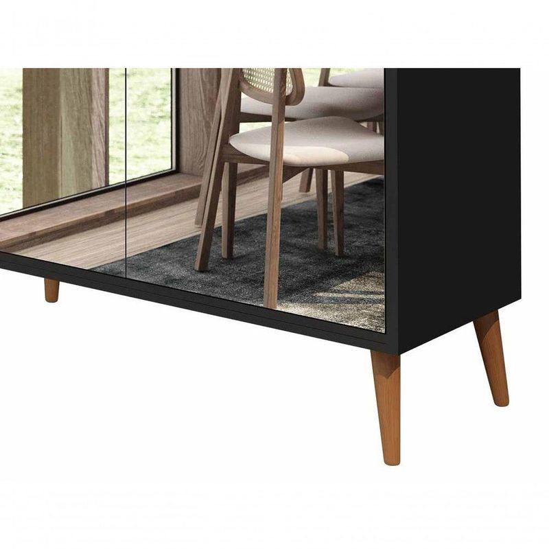 Buffet Aparador Retrô Com Espelho Delux 2 Portas Preto - MoveisaquiIdeal para organizar melhor sua sala de jantar ou de estar, o Buffet Aparador Retrô Delux 2 Portas - MoveisAqui trouxe de volta a pegada retrô que veio para ficar. Os pés estilo palito, levemente angulados, se destacam pelo charme que garante à peça. Seus compartimentos internos são ideais para armazenar e organizar diversos tipos de objetos pessoais, além de seu aparelho de jantar e demais itens que sejam necessários. Lindo, robusto e versátil, garante um espaço moderno e organizado.Dimensões do Produto Montado:Altura: 80 cmLargura: 90 cmProfundidade: 33 cmObservações:- Produzido em MDP;- 2 portas com dobradiças metálicas;- Portas com frente em espelho;- Pés palito, estilo retrô, em madeira pinus;- Peso suportado por prateleira: até 7kg;- Pintura Ultravioleta com acabamento fosco.