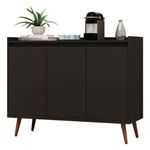 Buffet Aparador Retrô Delux 3 Portas Preto - MoveisaquiIdeal para organizar melhor sua sala de jantar ou de estar, o Buffet Aparador Retrô Delux 3 Portas - MoveisAqui trouxe de volta a pegada retrô que veio para ficar. Os pés estilo palito, levemente angulados, se destacam pelo charme que garante à peça. Seus compartimentos internos são ideais para armazenar e organizar diversos tipos de objetos pessoais, além de seu aparelho de jantar e demais itens que sejam necessários. Lindo, robusto e versátil, garante um espaço moderno e organizado.Dimensões do Produto Montado:Altura: 96 cmLargura: 120 cmProfundidade: 45 cmObservações:- Produzido em MDP;- 3 portas com dobradiças metálicas;- Pés palito, estilo retrô, em madeira pinus;- Peso suportado por prateleira: até 7kg;- Pintura Ultravioleta com acabamento semi brilho.