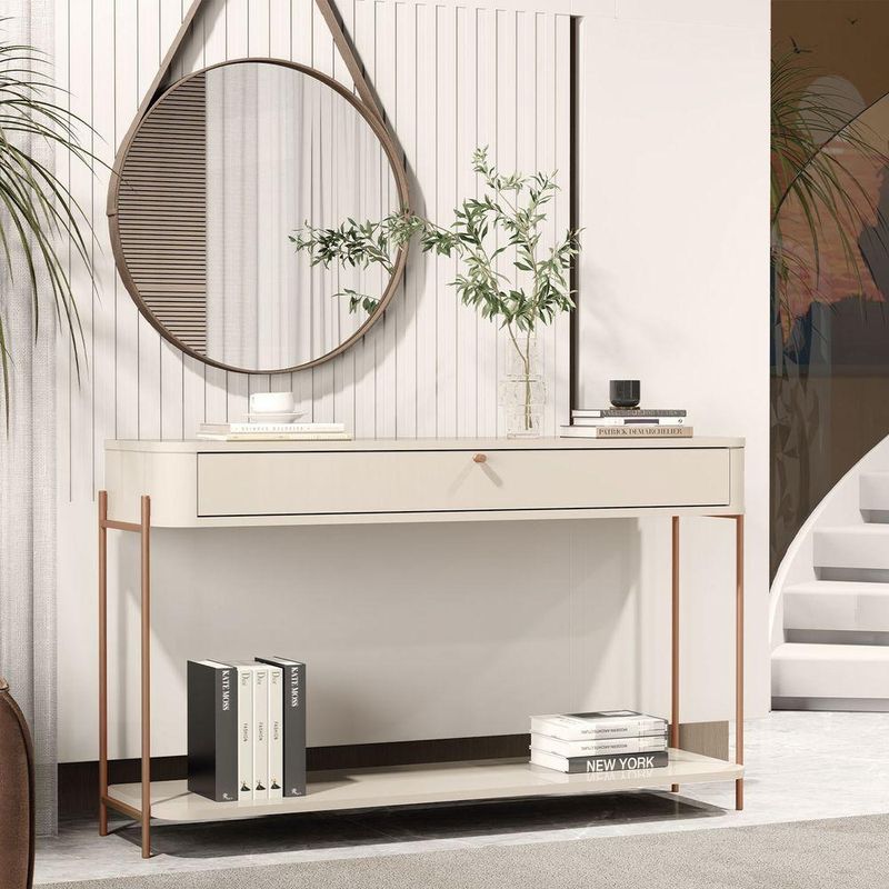 Buffet Aparador Tucupi Off White Pe Bronze - Moveis JbCom design contemporâneo e linhas bem definidas, o Aparador Tucupí é uma peça versátil e elegante para compor salas de estar, jantar, halls de entrada ou ambientes para acomodar objetos decorativos, vasos, luminárias ou bandejas, enquanto a estrutura firme garante estabilidade e durabilidade no uso diá modelo possui proporções equilibradas e visual leve, adaptando-se com facilidade a diferentes propostas de decoração.Produzido 100% em MDF, oferece acabamento de alto padrão e uma combinação perfeita entre beleza, funcionalidade e resistêões:Altura: 81,5cmLargura: 123cmProfundidade: 32,5cmObservações:- Produzido 100% em MDF com acabamento refinado- Tampo amplo ideal para apoio de objetos decorativos ou utilitários- Estrutura firme com visual leve e proporções modernas- Design versátil, ideal para salas, halls e ambientes integrados- Combina elegância e funcionalidade no dia a dia