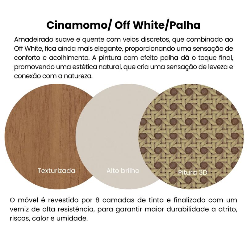 O Buffet Artely Móveis Charlote 80x80cm é um móvel compacto, funcional e com design sofisticado. Com linhas modernas e detalhes encantadores, ele oferece praticidade para o dia a dia e um toque decorativo que valoriza qualquer ambiente. Seu grande diferencial está na porta reversível, que permite escolher entre o acabamento em Off White ou Palha Indiana — um detalhe artesanal que traz leveza e elegância natural ao espaço. A textura entrelaçada da palha sintética remete à sofisticação e agrega personalidade ao móvel.Conta com três nichos abertos, para organizar objetos, utensílios ou exibir itens decorativos. A prateleira interna regulável aumenta a versatilidade, adaptando-se conforme sua necessidade. A porta com dobradiças metálicas e o puxador delicado que proporcionam um manuseio suave e discreto. A estrutura é composta por MDF e MDP 15mm, com pés robustos em MDF 25mm que garantem estabilidade e durabilidade. O acabamento é feito com pintura UV texturizada no padrão madeirado Cinamomo e alto brilho no Off White, unindo resistência e fácil manutenção. Pintura 3D no acabamento Palha para um efeito visual marcante Estrutura resistente em MDF e MDP de 15mm Fixação com minifix, cavilhas e parafusos Capacidade de até 5kg bem distribuídos Perfeito para salas de jantar, cozinhas ou ambientes multifuncionais Com o Buffet Charlote, você alia funcionalidade, estilo e qualidade em um só móvel. Uma solução charmosa para deixar sua casa ainda mais organizada e aconchegante.