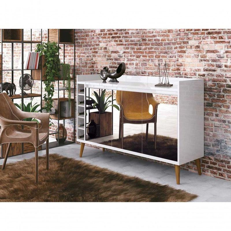 Buffet Com Adega Estilo Com Espelho Branco - MoveisaquiO Buffet com Adega Estilo com Espelho - MóveisAqui possui um lindo design que garante a sofisticação e o requinte que seu ambiente precisa. Suas portas e adegas organizam com perfeição diversos tipos de utensílios de cozinha, além de garrafas e seu superior possui um amplo espaço para acomodar objetos de decoração e outos itens que precisam estar sempre a mãões do Produto Montado:Altura: 99,5 cmLargura: 131,5 cmProfundidade: 45 cmObservações:- Produzido em MDF e MDP;- Pés Retrô;- Estrutura robusta;- 05 Adegas porta garrafas;- Sem puxadores, sistema interno;- Portas com espelho incluso;- Pintura com acabamento brilho.