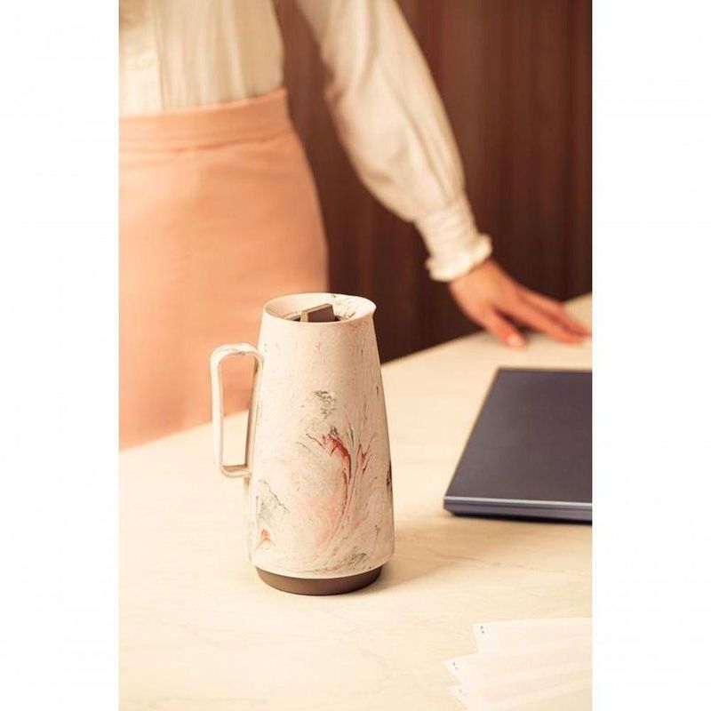 Bule Térmico Tramontina Exata 500ml Marmorizado CremePara quem valoriza charme à mesa e café sempre na temperatura certa, o bule térmico Tramontina Exata marmorizado rosa é aquele detalhe que faz toda a diferença. Com 500 ml de capacidade, ele é ideal para quem gosta de ter sempre por perto sua bebida favorita, seja um café fresquinho pela manhã ou um chá gelado no meio da tarde. Fabricado em plástico resistente com acabamento marmorizado e ampola interna de vidro, o bule térmico alia leveza e eficiência no dia a dia. Seu formato compacto se adapta facilmente a diferentes espaços, do home office à cozinha, enquanto o visual delicado na cor rosa traz um toque moderno e acolhedor para qualquer ambiente. A tampa com sistema de rolha e corta-pingos embutido garante um servir prático, sem desperdícios ou respingos. Versátil, ele mantém líquidos quentes ou frios por mais tempo e ainda facilita o uso com total . Perfeito para quem busca um bule térmico pequeno, elegante e funcional, com a qualidade que só a Tramontina oferece. Ideal para acompanhar as pausas do seu dia, seja no café da manhã, na mesa do lanche ou nos momentos de aconchego.Recomendações de Uso:- Conforme orientação do Fabricante: Testar primeiramente com Água. Testes não realizados da forma correta, será impossibilitado a troca.Modo de Uso: ;Recomendamos pré-aquecer/pré-refrigerar o produto com água antes do uso para manter a bebida aquecida/fria por mais tempo. Para evitar vazamentos, não encha o produto até o seu topo. Não agite o produto; Não olhe diretamente para dentro; Não coloque gelo seco, refrigerante, bebidas gaseificadas ou líquidos que possam gerar alta pressão; Cuidado ao manusear o produto, não deixe bater ou cair. Se vier a acontecer, certifique-se que não fiquem resíduos de vidro no interior; Todo manuseio de vidro (material frágil) deve ser feito com total atenção, e este produto com ampola de vidro não foge a essa regra; Não beba diretamente da garrafa; Verifique frequentemente o aperto das peças rosqueáveis (fundo/base); Não coloque bebida quente e, em seguida, bebida gelada ou vice-versa, pois isso pode danificar a ampola; Mantenha fora do alcance das crianças; Após o uso ou limpeza, aconselhamos deixar o produto aberto; Não remova a ampola de vidro do produto, somente se ela quebrar ou sofrer algum dano e houver necessidade de substituição; Não use o produto para transportar ou armazenar cubos de gelo, pois podem danificar a parte interna do bule; Para minimizar o crescimento de bactérias, não use o produto para guardar leite quente ou comidas de bebês. Lave o produto somente com detergente neutro e esponja macia; Não utilize escova com pontas que possam quebrar a ampola de vidro; Se houver odores desagradáveis, utilize uma solução com a medida de uma colher (sopa) de bicarbonato de sódio dissolvida em água quente (capacidade máxima) e deixe agir por 12 horas; após, enxague bem e realize a limpeza diária.- Foto meramente ilustrativa.Informações Adicionais:- Sistema corta-pingos embutido;- Seus componentes são BPA free;- Uso intuitivo com abertura estilo "rolha";- Cabo confortável com toque suave e muito ;- que direciona o fluxo da bebida, evitando respingos;- Robusto, simples e moderno, ocupa menos espaço na sua casa e durante o ;- Ideal para manter líquidos quentes ou frios na temperatura adequada por muito mais tempo;- A capacidade volumétrica poderá ter uma variação de até 10% em seu volume nominal indicado.