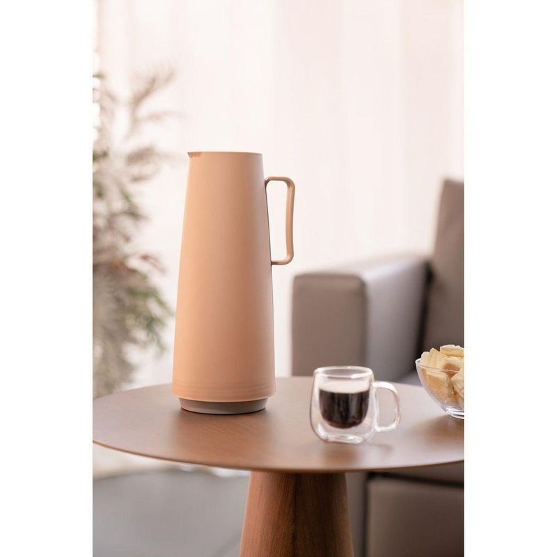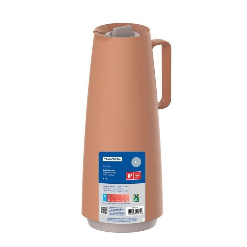 Bule Térmico Tramontina Exata Em Plástico Mocha Com Ampola De Vidro 1 L TramontinaBule Térmico Tramontina Exata em Plástico Mocha com Ampola de Vidro 1 L Tramontina -Bule Térmico Tramontina Exata em Plástico Mocha com Ampola de Vidro 1 LPara garantir praticidade para seu dia e manter suas bebidas na temperatura ideal, o bule térmico Tramontina Exata em plástico mocha com ampola de vidro 1 litro é indispensável. Ideal para levar pro trabalho, escola ou manter na sua cozinha, ele pode ser utilizado em líquidos quentes e frios, pois tem ampola de vidro especial. Sua utilização é primorosa e graças a sua abertura em estilo rolha, tem o direcionamento ideal das bebidas. O bule ainda é produzido em plástico, tem um cor especial que deixa seu dia a dia muito mais especial.A capacidade volumétrica poderá ter uma variação de até 10% em seu volume nominal indicado.Com linhas atemporais e design clean, o bule térmico da linha Exata combina com qualquer estilo e ambiente. Ideal para manter líquidos quentes ou frios na temperatura adequada por muito mais tempo. Uso intuitivo com abertura estilo rolha. Canal que direciona o fluxo da bebida, evitando respingos. Sistema corta-pingos embutido. Cabo confortável com toque suave e muito seguro. Robusto, simples e moderno, ocupa menos espaço na sua casa e durante o transporte. Praticidade no uso e segurança para toda a família. Leve e fácil de manusear. Seus componentes são BPA free. Higiênico e de fácil limpeza.Ampola de vidro para reposição: 61636/930.Cuidados com o produto Descarte todos os materiais de embalagem e lave o produto, Certifique-se de que o produto esteja bem fechado, não coloque o produto em forno elétrico, micro-ondas, freezer, geladeira e máquina de lavar louças, A capacidade volumétrica poderá ter uma variação de até 10% de seu volume nominal indicado. DICAS: Recomendamos pré-aquecer/pré-refrigerar o produto antes de usar, para manter por mais tempo aquecida/fria a bebida, Para evitar vazamentos, não encha até o topo do produto.CUIDADOS ESPECIAIS: Não agite o produto, Não olhe diretamente para dentro, Não beba diretamente no produto, Não coloque gelo seco, refrigerante, bebidas gaseificadas ou líquidos que possam gerar alta pressão, Não deixe o produto bater ou cair, não coloque bebida quente e em seguida a bebida gelada ou vice-versa, pois isso pode danificar a ampola, Por ser um produto de mesa, recomenda-se em manter o produto sempre na posição vertical,Mantenha fora do alcance das crianças, Após o uso ou limpeza, aconselhamos deixar o produto aberto, Não remova a ampola de vidro do produto, somente se ela quebrar ou sofrer algum dano e necessitar ser substituída, Todo manuseio de vidro deve ser feito com total atenção, e este produto com ampola de vidro não foge a essa regra, Verifique frequentemente o aperto das peças rosqueáveis (rolha e fundo/base).ORIENTAÇÕES DE LIMPEZA: Lave somente com detergente neutro e esponja macia, Não utilize escova com pontas que possam quebrar a ampola de vidro, Se houver odores desagradáveis, pode-se usar uma solução com a medida de 2 colheres (sopa) de bicarbonato de sódio dissolvidas em água quente (até sua capacidade máxima) e deixar agir por 12 horas, após, fazer a limpeza diária.Garantia90 dias de garantia legal para vícios ou defeitos de fabricação. - NORMA BRASILEIRA PARA GARRAFAS TÉRMICAS - NBR 13282 e conforme a versão atualizada emitida pela ABNT - ASSOCIAÇÃO BRASILEIRA DE NORMAS TÉCNICAS. -Características Gerais do Produto:Garantia: - 3 Meses
