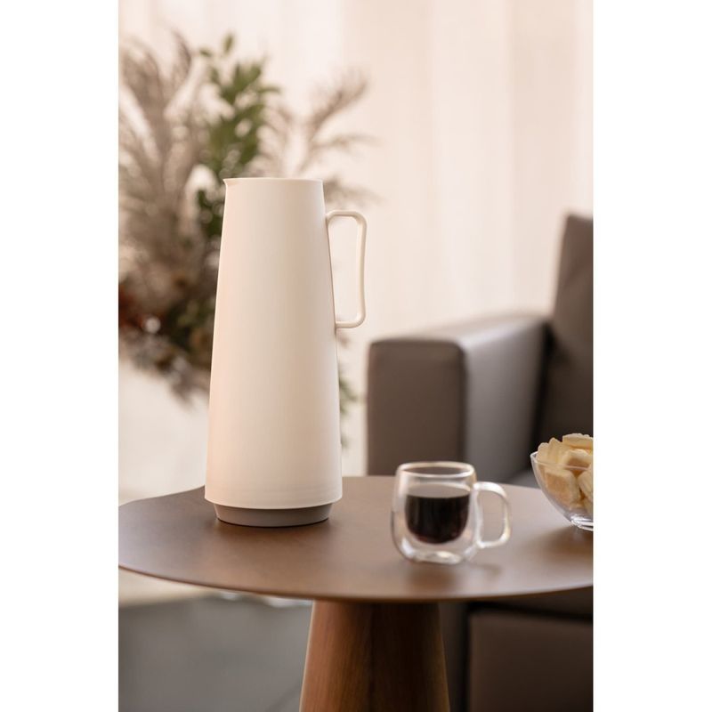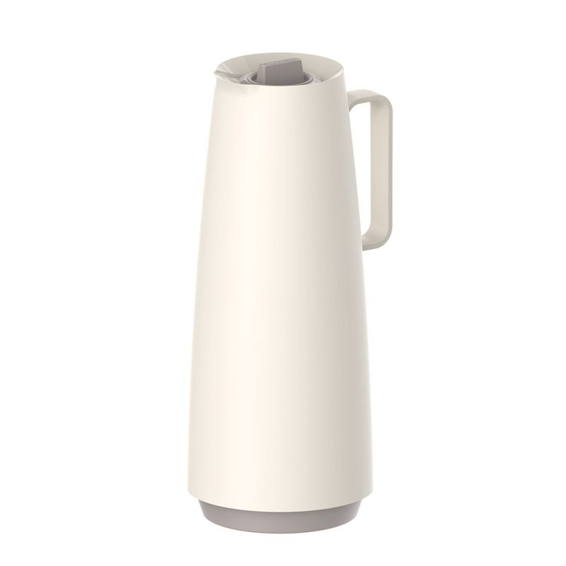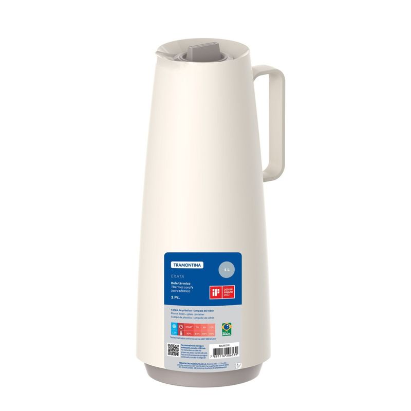 Bule Térmico Tramontina Exata em Plástico Vanilla com Ampola de Vidro 1 L Tramontina - Bule Térmico Tramontina Exata em Plástico Vanilla com Ampola de Vidro 1 L O bule térmico Tramontina Exata em plástico vanilla 1 litro é a opção perfeita para os amantes de café que desejam desfrutar de uma bebida quente ao longo do dia, sem comprometer a composição e o estilo da sua cozinha.Com design diferenciado, ele proporciona um toque de elegância à sua mesa e à sua cozinha. Fabricado em plástico, é um bule versátil, que pode ser utilizado tanto para lÃquidos quentes quanto frios. Sua abertura é em formato de rolha, com corta-pingos embutido, e garante praticidade e segurança no uso, tornando-o leve e extremamente confortável.Escolha Tramontina e tenha itens que facilitem sua rotina e tornem seu dia a dia muito mais gostoso! A capacidade volumétrica poderá ter uma variação de até 10% em seu volume nominal indicado.Com linhas atemporais e design clean, o bule térmico da linha Exata combina com qualquer estilo e ambiente. Ideal para manter lÃquidos quentes ou frios na temperatura adequada por muito mais tempo. Uso intuitivo com abertura estilo "rolha". Canal que direciona o fluxo da bebida, evitando respingos. Sistema corta-pingos embutido. Cabo confortável com toque suave e muito seguro. Robusto, simples e moderno, ocupa menos espaço na sua casa e durante o transporte. Praticidade no uso e segurança para toda a famÃlia. Leve e fácil de manusear. Seus componentes são BPA free. Higiênico e de fácil limpeza.Ampola de vidro para reposição: 61636/930. Cuidados com o produto Descarte todos os materiais de embalagem e lave o produto, Certifique-se de que o produto esteja bem fechado, não coloque o produto em forno elétrico, micro-ondas, freezer, geladeira e máquina de lavar louças, A capacidade volumétrica poderá ter uma variação de até 10% de seu volume nominal indicado. DICAS: Recomendamos pré-aquecer/pré-refrigerar o produto antes de usar, para manter por mais tempo aquecida/fria a bebida, Para evitar vazamentos, não encha até o topo do produto.CUIDADOS ESPECIAIS: Não agite o produto, Não olhe diretamente para dentro, Não beba diretamente no produto, Não coloque gelo seco, refrigerante, bebidas gaseificadas ou lÃquidos que possam gerar alta pressão, Não deixe o produto bater ou cair, não coloque bebida quente e em seguida a bebida gelada ou vice-versa, pois isso pode danificar a ampola, Por ser um produto de mesa, recomenda-se em manter o produto sempre na posição vertical,Mantenha fora do alcance das crianças, Após o uso ou limpeza, aconselhamos deixar o produto aberto, Não remova a ampola de vidro do produto, somente se ela quebrar ou sofrer algum dano e necessitar ser substituÃda, Todo manuseio de vidro deve ser feito com total atenção, e este produto com ampola de vidro não foge a essa regra, Verifique frequentemente o aperto das peças rosqueáveis (rolha e fundo/base).ORIENTAÃÃES DE LIMPEZA: Lave somente com detergente neutro e esponja macia, Não utilize escova com pontas que possam quebrar a ampola de vidro, Se houver odores desagradáveis, pode-se usar uma solução com a medida de 2 colheres (sopa) de bicarbonato de sódio dissolvidas em água quente (até sua capacidade máxima) e deixar agir por 12 horas, após, fazer a limpeza diária. Garantia 90 dias de garantia legal para vÃcios ou defeitos de fabricação. - - Características Gerais do Produto: Garantia: • 3 Meses