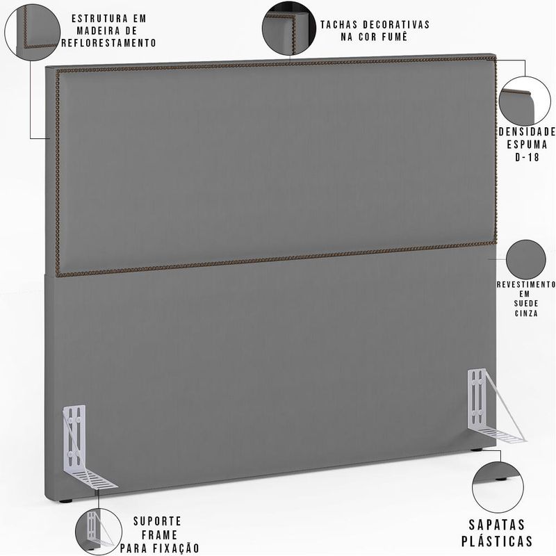 A Cabeceira Box Casal King Com Tachas 195 cm Vicenza L02 Suede Cinza - Lyam Decor vai trazer ainda mais elegância ao seu quarto! Todos os detalhes foram pensados para criar uma atmosfera de aconchego e tranquilidade. Produzida com materiais de excelente qualidade e acabamento impecável, o revestimento em Suede combina majestosamente com as tachas decorativas. Pode ser disposta com mesas de cabeceira e apoio, calçadeira ou recamier, valoriza seu ambiente e cria um match perfeito em qualquer composição. Você merece o melhor, garanta já a sua!! Dimensões do produto (L x A x P) 195 x 127 x 8 cm Altura do chão à base: 66 cm Diâmetro da tacha decorativa: 9,5 mm Dimensões do suporte frame (L x A x P) 5,5 x 13,5 x 16,5 cm Características: Estrutura em madeira reflorestada. Revestimento em tecido Suede na cor Cinza. Acabamento em fita de tachas de ferro galvanizado, na cor Fumê. Densidade da Espuma D-18. Acompanha todos os acessórios para fixação. Acompanha suporte frame produzido em chapa de ferro com acabamento em esmalte PU na cor alumínio. Possui sapatas plásticas. Características do Frame: Produzido em chapa de ferro 1,5 mm. Acabamento em esmalte PU na cor Alumínio. Acessórios para fixação: 04 Parafusos cabeça chata auto atarraxantes 5,0x25mm e 04 arruelas 1/4. - Por se tratar de estofado as medidas podem ter uma pequena variação de até 3 cm. - A tonalidade do produto real poderá ter ligeira variação devido o lote de tecidos. - A limpeza deve ser feita com pano levemente umedecido em água limpa, sem esfregar, não utilizar produtos abrasivos, desengordurantes, álcool ou solvente. Observações importantes: - Produto para uso residencial em ambiente interno, não devendo ficar exposto diretamente ao sol, calor e umidade excessivos. - Pode haver alguma diferença de tonalidade entre a imagem e o produto real, por conta do tratamento de imagens e a calibração de cores do seu monitor. - As imagens são meramente ilustrativas, não acompanham objetos de decoração e eletrônicos. - Ao receber a mercadoria, o cliente deve verificar as condições da embalagem, caso haja alguma avaria não assine o comprovante de recebimento. - Montagem, desmontagem e outras instalações serão de responsabilidade do cliente. Não nos responsabilizamos, no ato da entrega, por subir escadas/elevadores ou pelo transporte por guincho em apartamentos. Eventuais despesas são de responsabilidade do comprador. - Confira as dimensões do produto e certifique-se de que passará normalmente por supostos elevadores, portas, escadas e/ou corredores de sua residência.