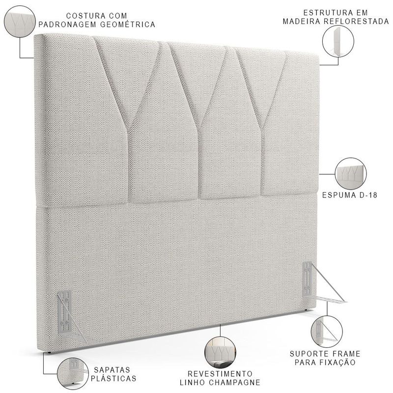 Poder desfrutar de momentos de paz e tranquilidade em nosso lar é imprescindível para mantermos um equilíbrio mental e físico e conseguirmos de fato descansar e nos desconectar um pouco da rotina caótica que vivemos hoje. Pensando nisso, a decoração é ponto chave na transformação do ambiente e a Cabeceira Cama Box Casal 140 cm Aurora W01 Linho Champagne - Lyam Decor vem para proporcionar ainda mais sensações de conforto ao seu quarto. Confeccionada com materiais de qualidade excepcional, é estofada e possui costura de padronagem geométrica em seu revestimento, que imprime bastante modernidade, além de criar um match incrível com outros móveis como mesa de cabeceira, calçadeira ou recamier. Você merece o melhor, garanta já a sua! Dimensões da Cabeceira (L x A x P) 140 x 120 x 8 cm Altura do chão à base: 55 cm Dimensões do Frame (L x A x P) 5,5 x 13,5 x 16,5 cm Características da Cabeceira: Estrutura em madeira reflorestada. Revestimento em tecido Linho na cor Champagne. Densidade da Espuma D-18. Acompanha todos os acessórios para fixação. Possui sapatas plásticas. Características do Frame: Produzido em chapa de ferro 1,5 mm. Acabamento em esmalte PU na cor Alumínio. Acessórios para fixação: 04 Parafusos cabeça chata auto atarraxantes 5,0x25mm e 04 arruelas 1/4. - Por se tratar de estofado as medidas podem ter uma pequena variação de até 3 cm. - A tonalidade do produto real poderá ter ligeira variação devido o lote de tecidos. - A limpeza deve ser feita com pano levemente umedecido em água limpa, sem esfregar, não utilizar produtos abrasivos, desengordurantes, álcool ou solvente. Observações importantes: - Produto para uso residencial em ambiente interno, não devendo ficar exposto diretamente ao sol, calor e umidade excessivos. - Pode haver alguma diferença de tonalidade entre a imagem e o produto real, por conta do tratamento de imagens e a calibração de cores do seu monitor. - As imagens são meramente ilustrativas, não acompanham objetos de decoração e eletrônicos. - Ao receber a mercadoria, o cliente deve verificar as condições da embalagem, caso haja alguma avaria não assine o comprovante de recebimento. - Montagem, desmontagem e outras instalações serão de responsabilidade do cliente. Não nos responsabilizamos, no ato da entrega, por subir escadas/elevadores ou pelo transporte por guincho em apartamentos. Eventuais despesas são de responsabilidade do comprador. - Confira as dimensões do produto e certifique-se de que passará normalmente por supostos elevadores, portas, escadas e/ou corredores de sua residência.