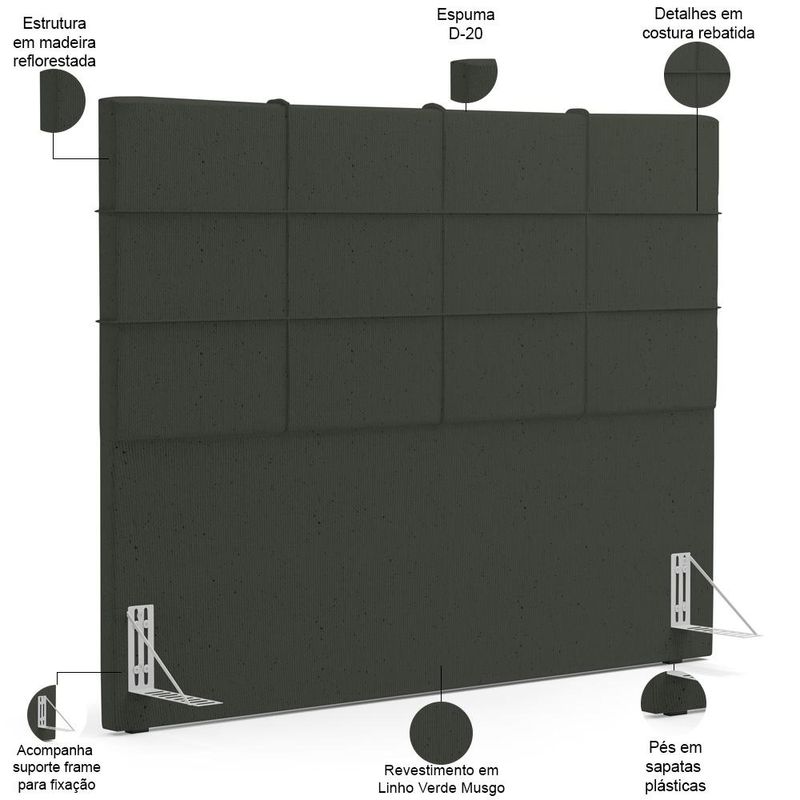 A deslumbrante Cabeceira Roma chegou para trazer a comodidade essencial para suas horas de descanso, além disso é um elemento de destaque para qualquer cama, proporcionando não apenas conforto mas também toques de elegância e requinte ao ambiente. Traz consigo um design meticuloso, feita com materiais de alta qualidade, confere um aspecto sofisticado e agradável ao toque, agregando uma textura suave ao ambiente. Vale ressaltar seus detalhes em costura rebatida que trazem o acabamento impecável, sendo assim uma peça de arte que eleva o charme do seu quarto. Seja lendo, assistindo TV ou simplesmente descansando, a superfície estofada lhe proporciona um conforto excepcional! Uma declaração de bom gosto que transforma o seu quarto em um retiro de elegância e serenidade. Garanta já a sua! Dimensões da Cabeceira (L x A x P) 140 x 120 x 8 cm Altura do chão à base: 55 cm Dimensões do Frame (L x A x P) 5,5 x 13,5 x 16,5 cm Características da Cabeceira: Estrutura em Madeira reflorestada. Revestimento em Linho na cor Verde Musgo, com acabamento semi brilho. Estofada com Espuma D-20. Acompanha todos os acessórios para fixação. Pés em sapatas plásticas. Características do Frame: Produzido em chapa de ferro 1,5 mm. Acabamento em esmalte PU na cor Alumínio. Acessórios para fixação: 04 Parafusos cabeça chata auto atarraxantes 5,0x25mm e 04 arruelas 1/4. - Por se tratar de estofado as medidas podem ter uma pequena variação de até 3 cm. - A tonalidade do produto real poderá ter ligeira variação devido o lote de tecidos. - A limpeza deve ser feita com pano levemente umedecido em água limpa, sem esfregar, não utilizar produtos abrasivos, desengordurantes, álcool ou solvente. Observações importantes: - Produto para uso residencial em ambiente interno, não devendo ficar exposto diretamente ao sol, calor e umidade excessivos. - Pode haver alguma diferença de tonalidade entre a imagem e o produto real, por conta do tratamento de imagens e a calibração de cores do seu monitor. - As imagens são meramente ilustrativas, não acompanham objetos de decoração e eletrônicos. - Ao receber a mercadoria, o cliente deve verificar as condições da embalagem, caso haja alguma avaria não assine o comprovante de recebimento. - Montagem, desmontagem e outras instalações serão de responsabilidade do cliente. Não nos responsabilizamos, no ato da entrega, por subir escadas/elevadores ou pelo transporte por guincho em apartamentos. Eventuais despesas são de responsabilidade do comprador. - Confira as dimensões do produto e certifique-se de que passará normalmente por supostos elevadores, portas, escadas e/ou corredores de sua residência.
