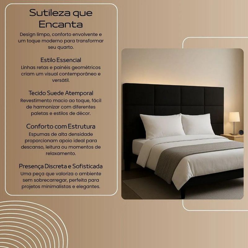 Cabeceira Cama Box Casal 140cm Elena Estofada Preto Elena: A Cabeceira que Transforma o Quarto em um Refúgio de PersonalidadeHá peças que não passam despercebidas. A Cabeceira Elena é uma delas. Com seu revestimento macio e aparência marcante, ela não apenas complementa a cama, ela comanda o ambiente. Ideal para quem busca imprimir sofisticação e estilo ao décor, Elena convida o olhar e o toque, criando uma atmosfera de puro aconchego visual e sensorial.Seu design geométrico, com módulos simétricos, remete ao estilo Contemporâneo, valorizando linhas retas e a força dos volumes. Perfeita para ambientes modernos com alma criativa, ela harmoniza-se tanto com paletas neutras quanto com composições mais arrojadas, sendo a protagonista de uma decoração autêntica.Imagine essa peça em contraste com paredes claras, iluminação indireta e texturas naturais – o resultado é um quarto com personalidade, elegância e calor emocional. O acabamento suave acrescenta uma camada de conforto e sofisticação tátil, despertando os sentidos e convidando ao relaxamento.Mais do que um móvel, Elena é uma declaração de estilo. Ideal para quem não tem medo de transformar o quarto em um espaço de expressão pessoal, onde cada detalhe reflete quem você é.ESPECIFICAÇÕESEstrutura: Madeira de Eucalipto Reflorestada;Espuma: D-23;Modelo dos Pés: pés em material polímero de alta resistência ;Grampos: de aço galvanizados;Revestimento: Tecido Suede;DIMENSÕES DA CABECEIRAAltura total: 126cm;Largura total: 140cm;Profundidade total: 12cm;Pés:12cm;Peso: 20kg;EXCELÊNCIA EM CADA DETALHENa Divani, qualidade não é promessa — é prática diária. Por isso, cada móvel passa por testes rigorosos que avaliam desde a estrutura em madeira até a precisão da costura e o acabamento da tapeçaria. Mas, mesmo com todo esse cuidado, sabemos que imprevistos podem acontecer. Se dentro de 90 dias após a entrega você identificar algum defeito de fabricação ou dano ocasionado no transporte, nossa equipe de suporte está pronta para atender você com empatia, agilidade e eficiência. Garantimos não apenas um produto de alto padrão, mas também um pós-venda humano, dedicado a manter sua experiência Divani à altura do que ela merece ser: impecável.SOBRE A DIVANINascida em Arapongas, o coração pulsante do maior polo moveleiro do Sul do Brasil, a Divani é fruto de uma história familiar movida pela paixão por design e sofisticação. Em meio a um cenário onde a excelência da matéria-prima encontra o talento de uma mão de obra altamente qualificada, criamos mais do que móveis: entregamos experiências. Cada peça carrega o compromisso com o conforto, a estética refinada e o desejo genuíno de transformar ambientes em refúgios de bem-estar. Acreditamos que o lar é uma extensão da alma – e é por isso que, desde a origem, cultivamos o cuidado artesanal e o olhar atento às tendências internacionais. Divani é onde o requinte encontra propósito, e o design ganha calor humano.CUIDADOS COM A LIMPEZAUtilizar um pano limpo e seco. Não limpar com produtos abrasivos ou escovas. Não deixar exposta à luz do sol diretamente pois isso irá diminuir a vida útil do produto, fazendo-o envelhecer precocemente. Este produto não é recomendado para ambientes externos onde possa receber chuva.MONTAGEMNivel de montagem simples .Na parte de trás da cabeceira abrir o forro para retirar os pés e realizar a junção da cabeceira no box.Necessita rosquear os pés.INFORMAÇÕES IMPORTANTES- Todos os produtos vão embalados com total segurança;- A entrega do produto é realizada em todo território nacional, até onde as rodovias alcançam, entregas fluviais ou aéreas devem ser cotadas à parte;- Objetos decorativos que aparecem na foto não acompanham o produto;- Pode haver alguma diferença de tonalidade entre a imagem e o produto real, por conta do tratamento de imagens e a calibração de cores do seu monitor;- Por se tratar de estofado as medidas podem ter uma pequena variação em até 3 cm;- Confira as dimensões do produto e certifique-se de que passará normalmente por supostos elevadores, portas, escadas e/ou corredores de sua residência, já que nossa entrega não inclui a subida de lances de escada, ou o lançamento de produtos;- Ao receber a mercadoria, o cliente deve verificar as condições da embalagem, caso haja alguma avaria não assine o comprovante de recebimento;- Observando as orientações acima, evita-se futuros desagrados ou imprevistos com a entrega do produto. Havendo despesas adicionais, serão de responsabilidade do cliente.