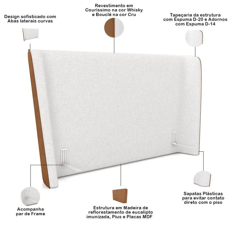 Mergulhe em um mar de conforto e elegância ao descansar em grande estilo em um quarto de casal com a Cabeceira Cama Box Casal Nilo, da Lyam Decor. Essa cabeceira estofada é mais do que um móvel, é uma experiência. Com design moderno e abas laterais curvas, essa cabeceira casal agrega um toque de personalidade, transformando o seu quarto em um espaço suave e sofisticado. Sinta a maciez do tecido a cada toque e deixe-se levar pela sensação de aconchego que somente a cabeceira Nilo pode proporcionar. Desperte seus sentidos e transforme seu quarto em um verdadeiro refúgio. Adicione ao seu carrinho e aproveite! Dimensões da Cabeceira (L x A x P) 195 x 110 x 42 cm Medidas Internas: Largura interna: 140 cm Profundidade interna inferior: 35 cm Profundidade interna superior: 24 cm Características: Estrutura em madeira de reflorestamento de eucalipto, pinus e placas de MDF e imunizada contra mofo, cupim e micro-organismos. Revestimento em tecido Couríssimo na cor Whisky e Bouclê na cor Cru. Sapatas plásticas para evitar contato direto com o piso. Tapeçada com espuma D-20 e adornos com espuma D-14. Design sofisticado com abas laterais curvas. Ideal para cama casal padrão de 138cm. Acompanha par de frame. - Por se tratar de estofado as medidas podem ter uma pequena variação de até 3 cm. - A tonalidade do produto real poderá ter ligeira variação devido o lote de tecidos. - Indicado para uso residencial, sua limpeza deve ser feita com pano levemente umedecido em água limpa, sem esfregar, não utilizar produtos abrasivos, desengordurantes, álcool ou solvente. Observações importantes: - Produto para uso residencial em ambiente interno, não devendo ficar exposto diretamente ao sol, calor e umidade excessivos. - Pode haver alguma diferença de tonalidade entre a imagem e o produto real, por conta do tratamento de imagens e a calibração de cores do seu monitor. - As imagens são meramente ilustrativas, não acompanham objetos de decoração e eletrônicos. - Ao receber a mercadoria, o cliente deve verificar as condições da embalagem, caso haja alguma avaria não assine o comprovante de recebimento e entre em contato com nossa loja para orientações. - Montagem, desmontagem e outras instalações serão de responsabilidade do cliente. Não nos responsabilizamos, no ato da entrega, por subir escadas/elevadores ou pelo transporte por guincho em apartamentos. Eventuais despesas são de responsabilidade do comprador. - Confira as dimensões do produto e certifique-se de que passará normalmente por supostos elevadores, portas, escadas e/ou corredores de sua residência. - Para mais informações, acesse nossa Central de Atendimento.